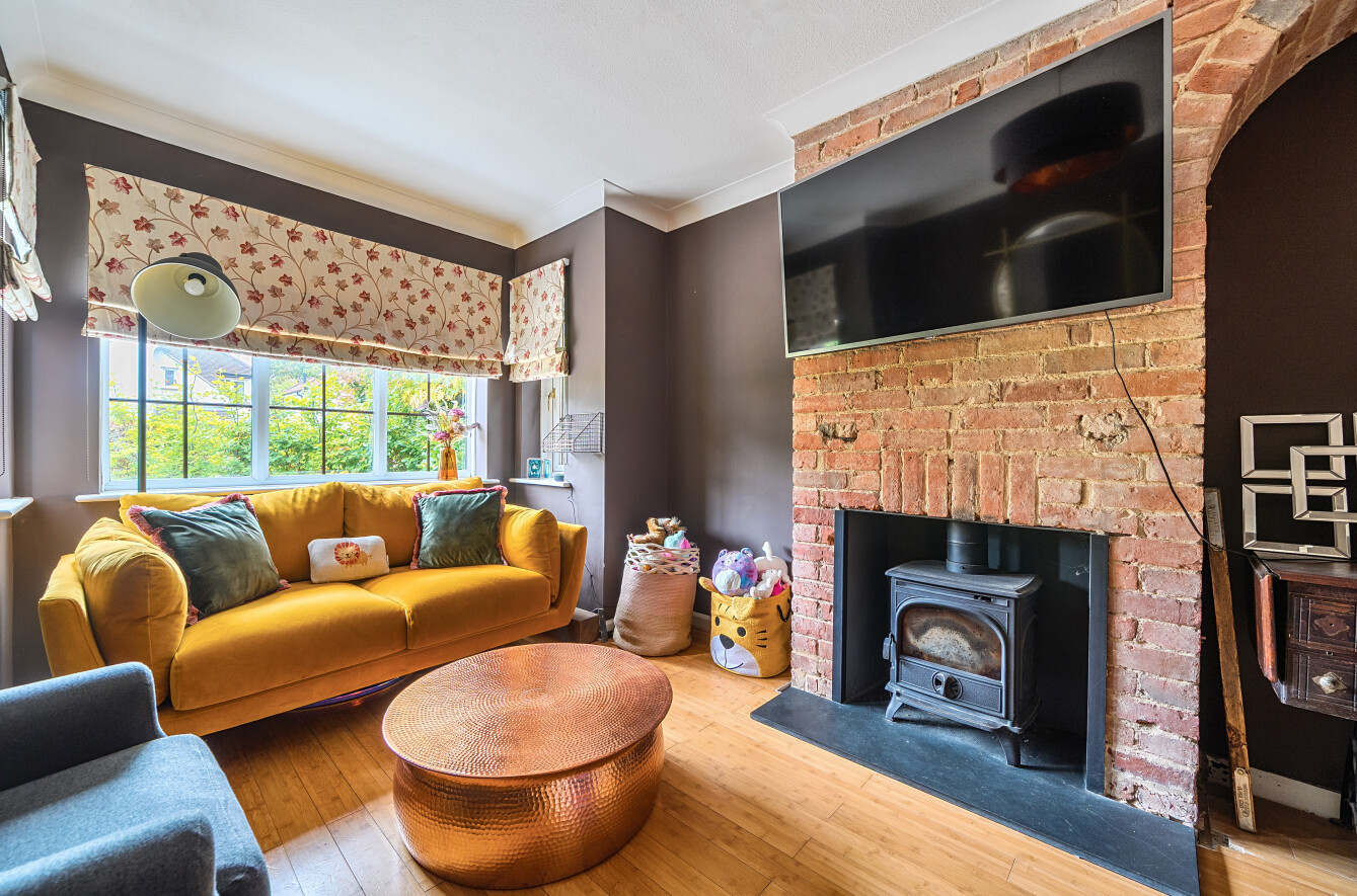 Across the hallway, an additional snug matches the accomplished aesthetic of the renovation generating plenty of options to be tailored to suit your own lifestyle needs. Leaded bay windows add a picture-perfect quality and together with the rich grey palette a wood burner lends a wonderful cosiness within the exposed brick chimney breast that arches over an adjacent alcove. Sympathetic to the original charm of the property, an enviably large kitchen/dining room is fully fitted with Shaker-style cabinetry topped with solid wood. Proffering an abundance of storage and work space, the thoughtful arrangement accommodates space for a freestanding dishwasher and fridge freezer as well as the quintessential design of a British Racing Green range cooker sitting sleekly within the original chimney breast. The more than generous proportions easily accommodate a dedicated dining or breakfast table and flow into a superbly sized utility room. It's there that Shaker-style cabinetry and countertops match those of the kitchen giving a further demonstration of the attention to detail that features throughout. Caffeine lovers will appreciate the chance to a have a coffee station and whilst a perfectly placed skylight enhances the stream of sunlight, a duo of demi-glazed doors supplies handy access to both gardens. A stylish cloakroom is on hand for guests.