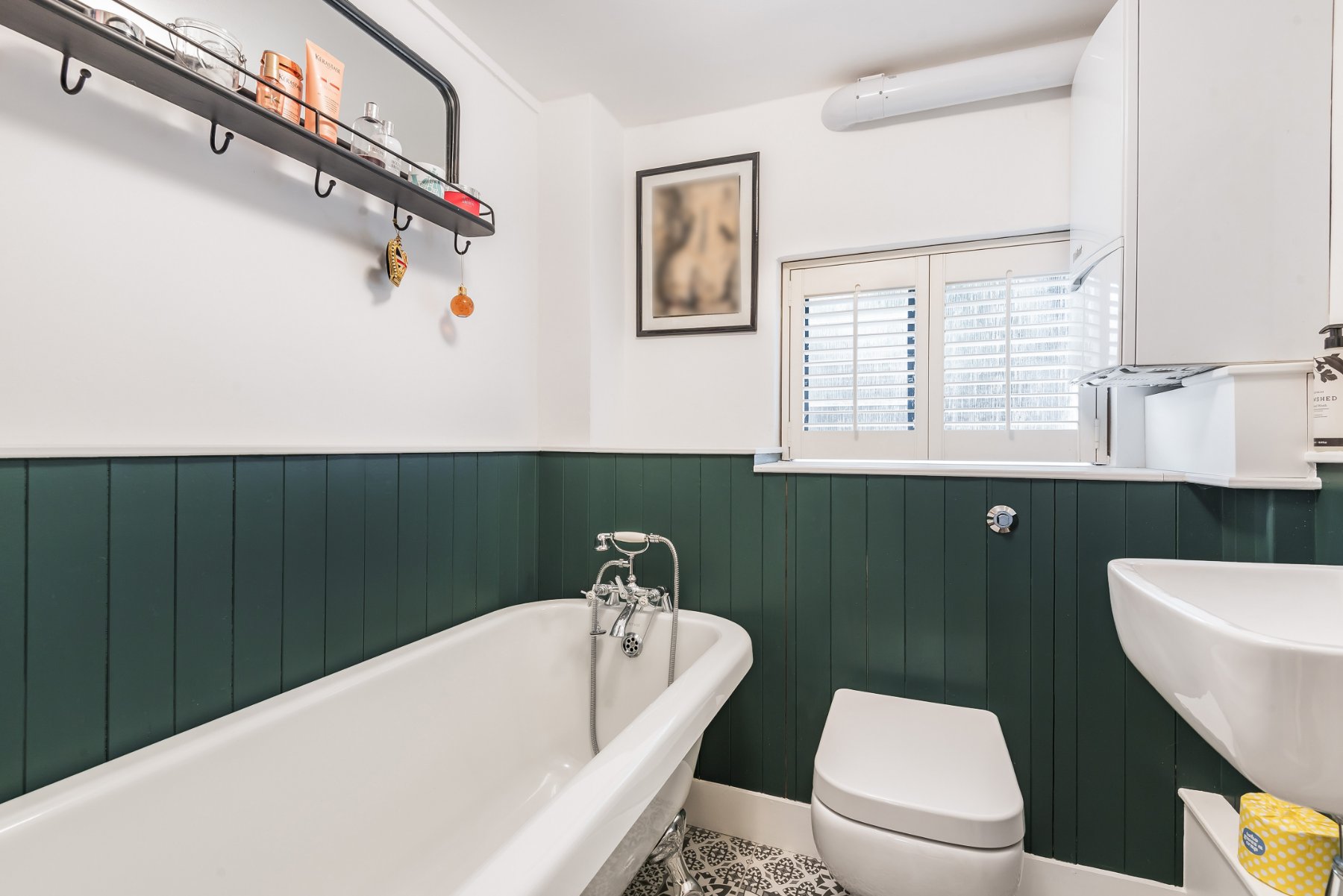 - Fantastic bathroom with wood panelling, a luxurious freestanding roll top bath and an encaustic patterned tile floor
