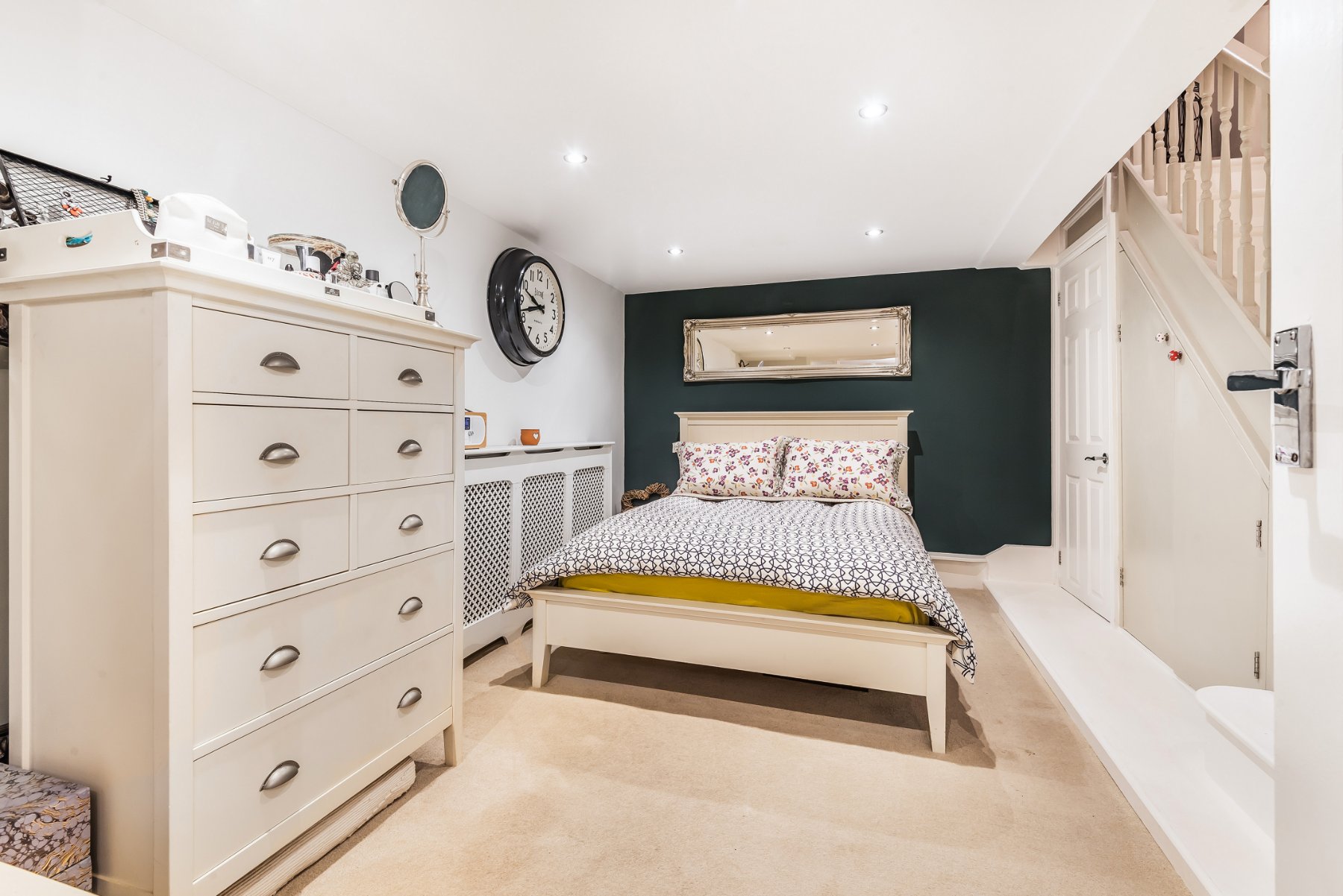 - Stylish double bedroom with a heritage blue feature wall and recessed storage