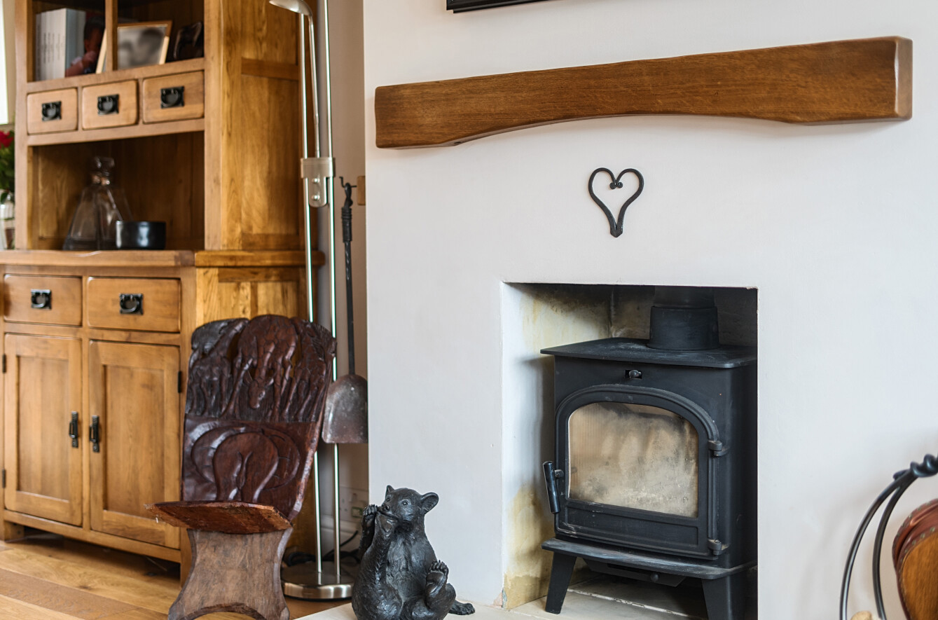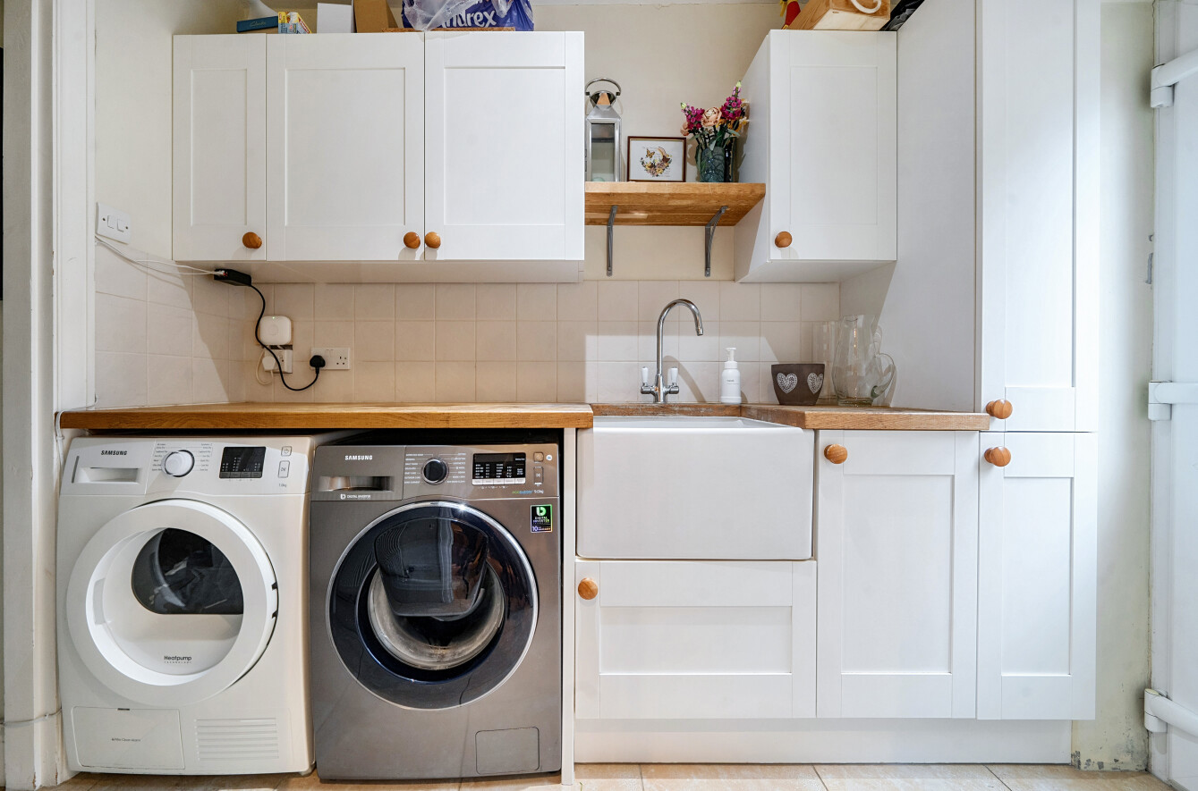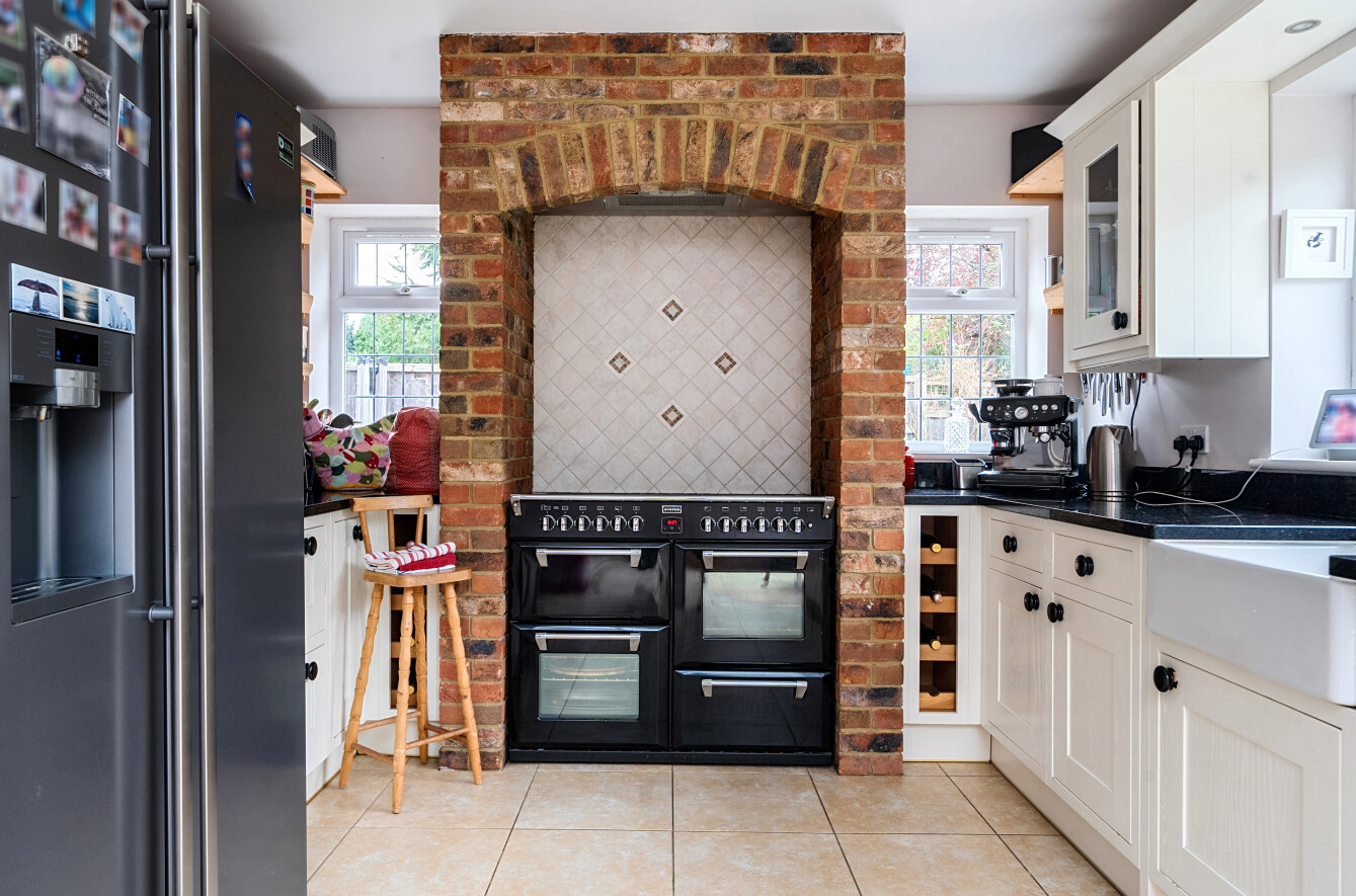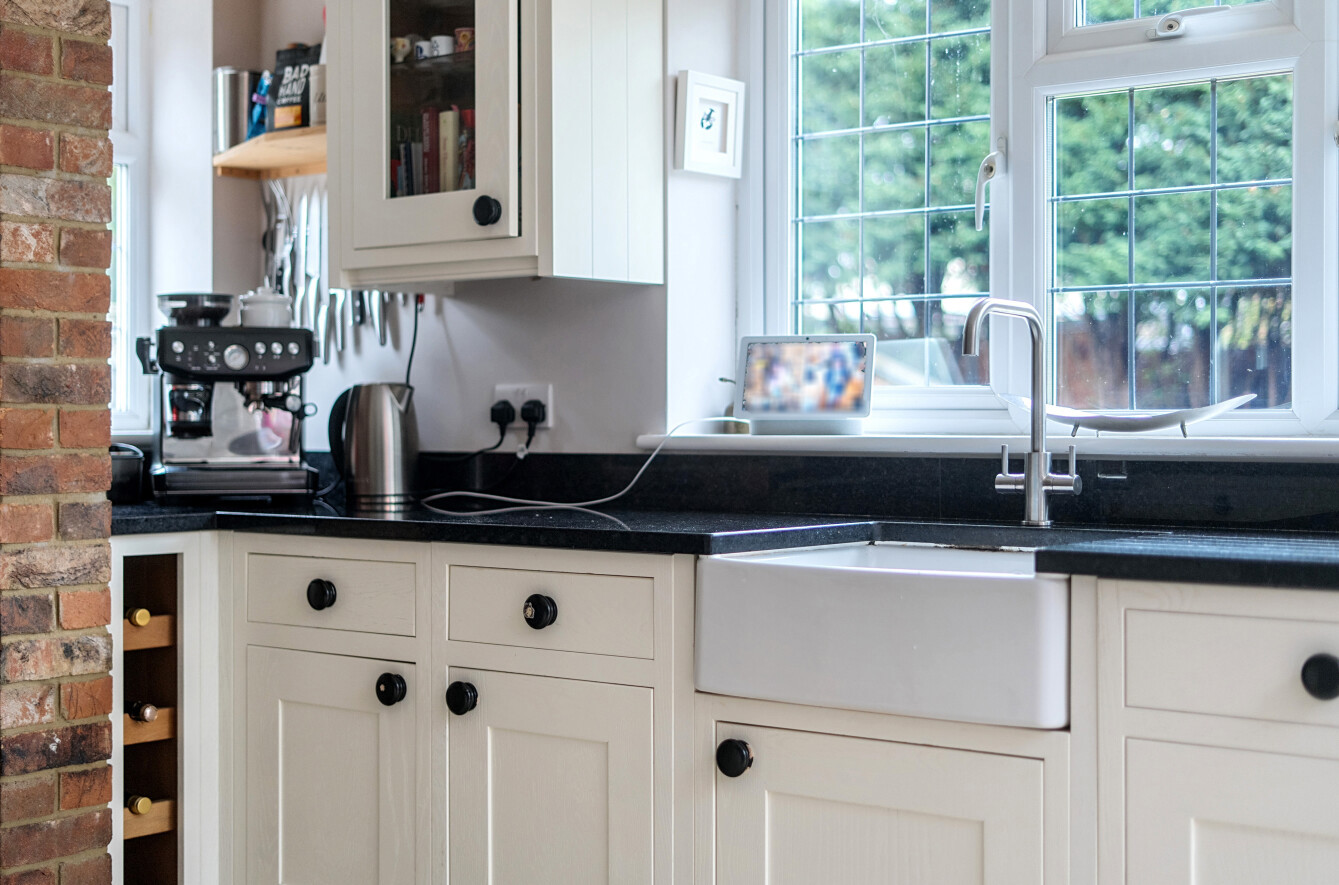 - Shaker-style kitchen with exposed brick chimney breast and butler sink