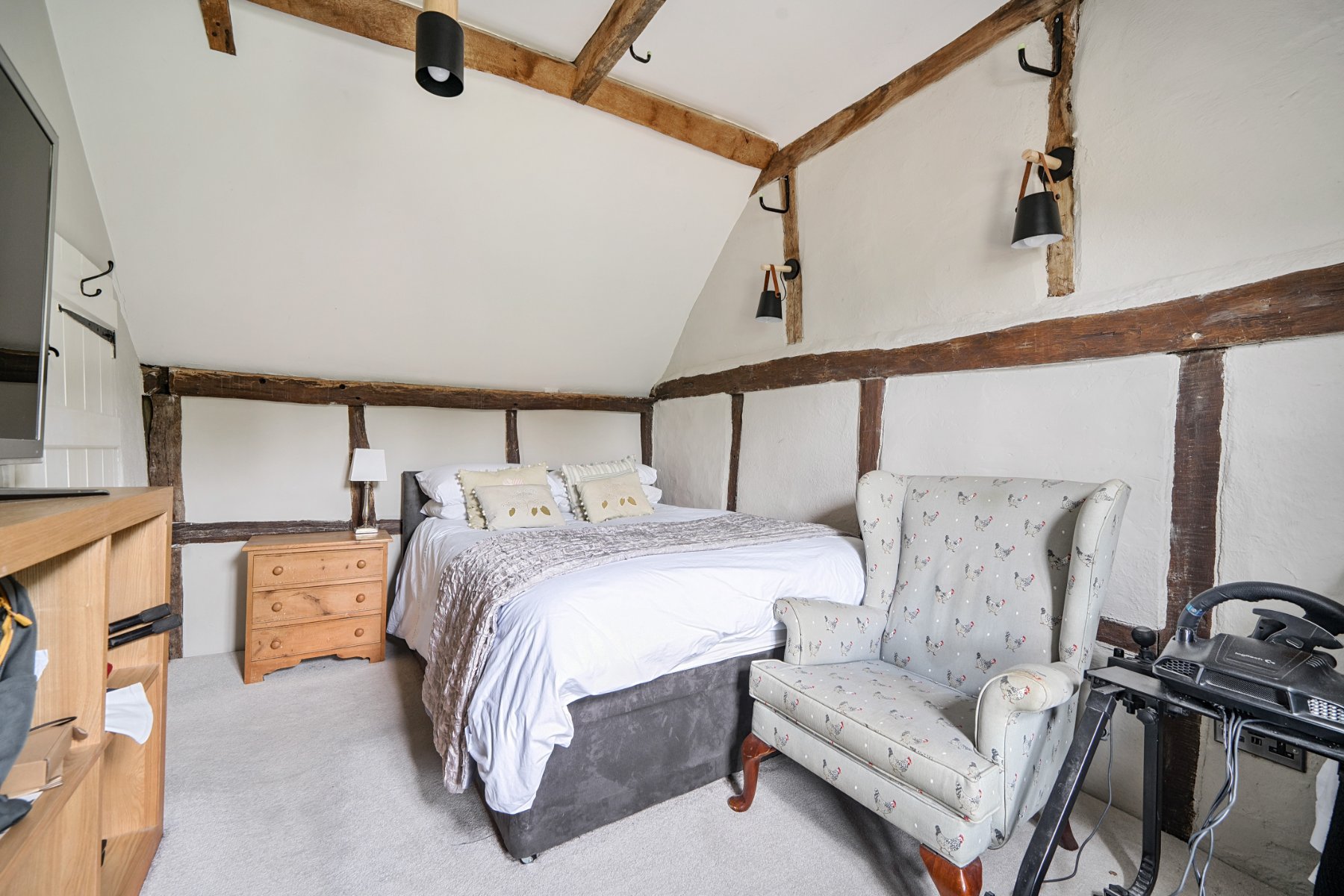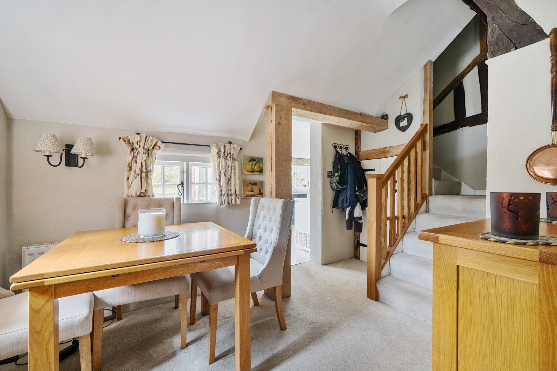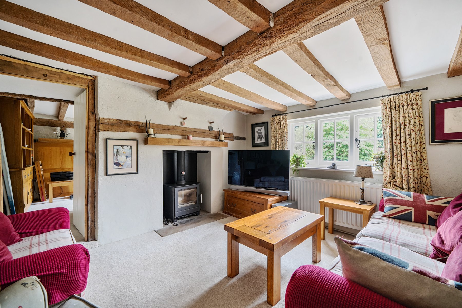 - Exposed beams, timber framed walls and a working fireplace with wood burner