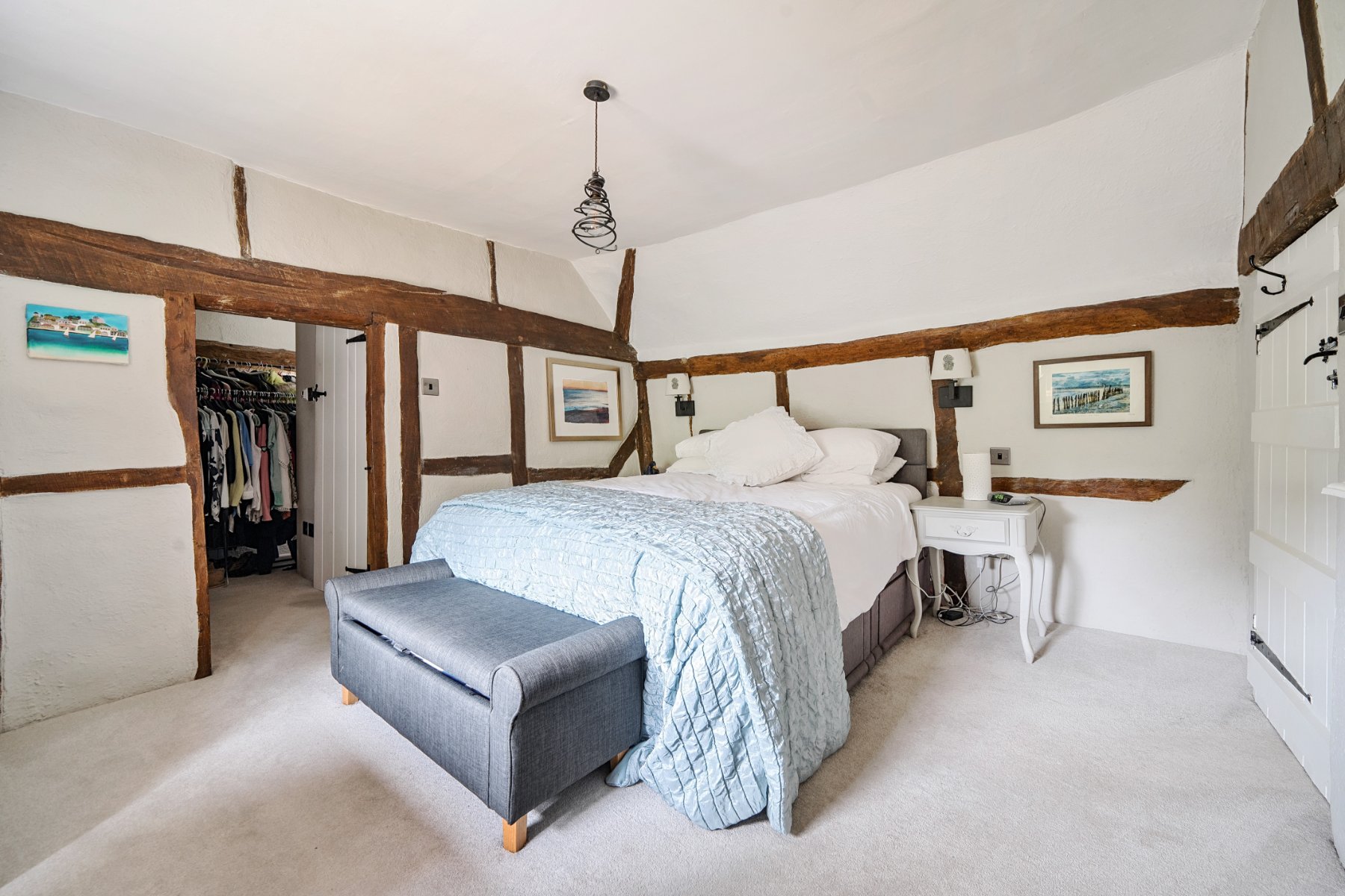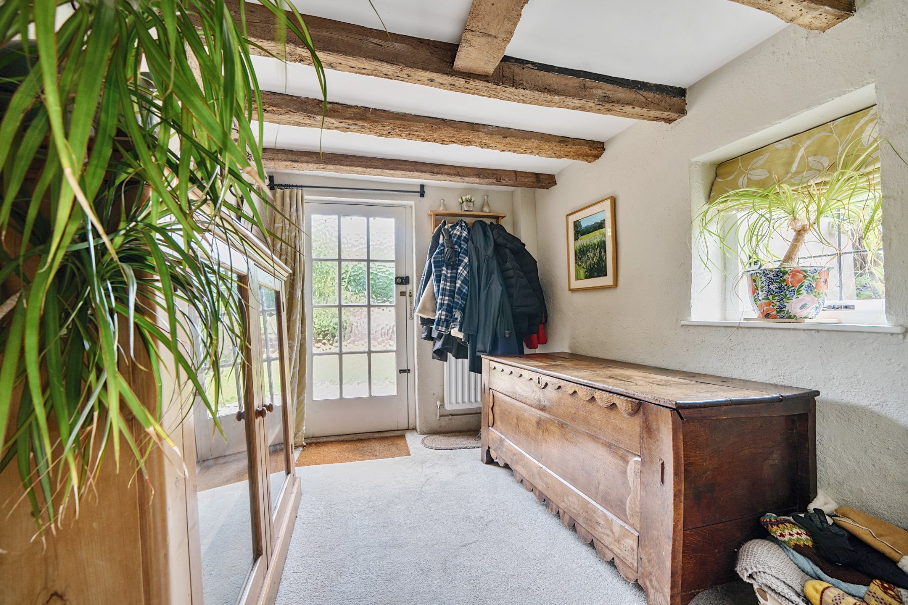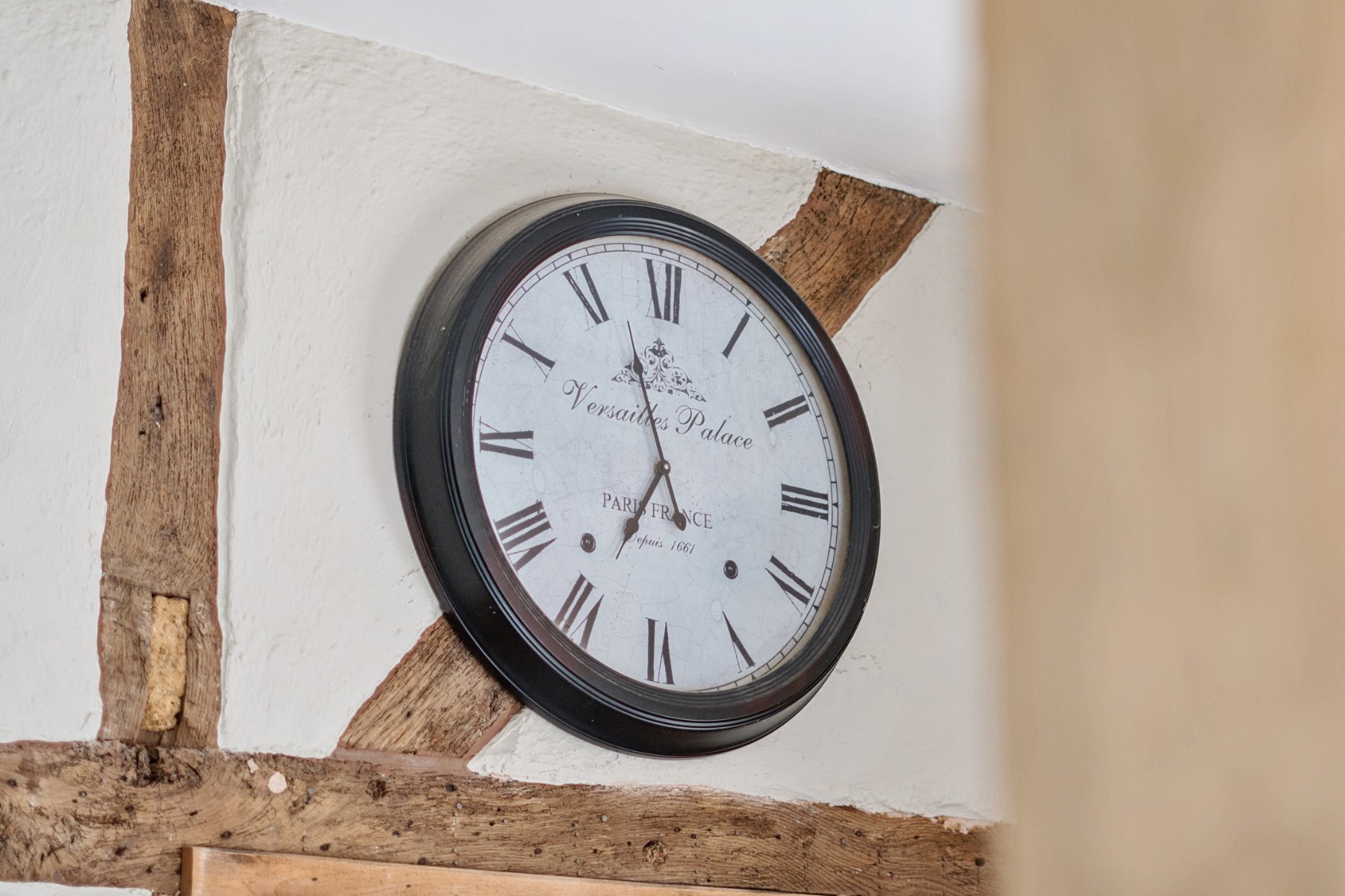 - Exposed beams, timber framed walls and a working fireplace with wood burner