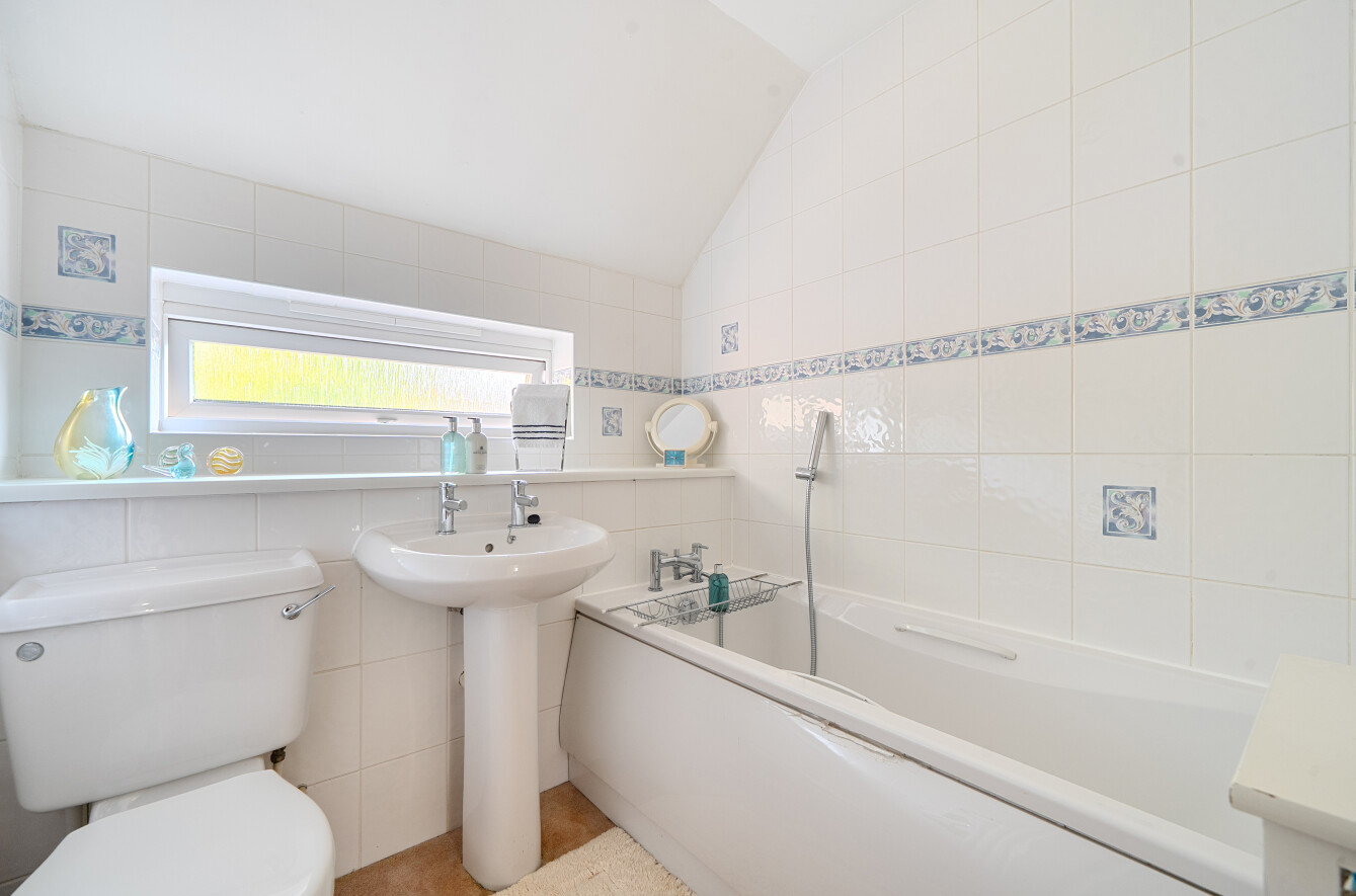 - Family bathroom with white suite and over-bath shower