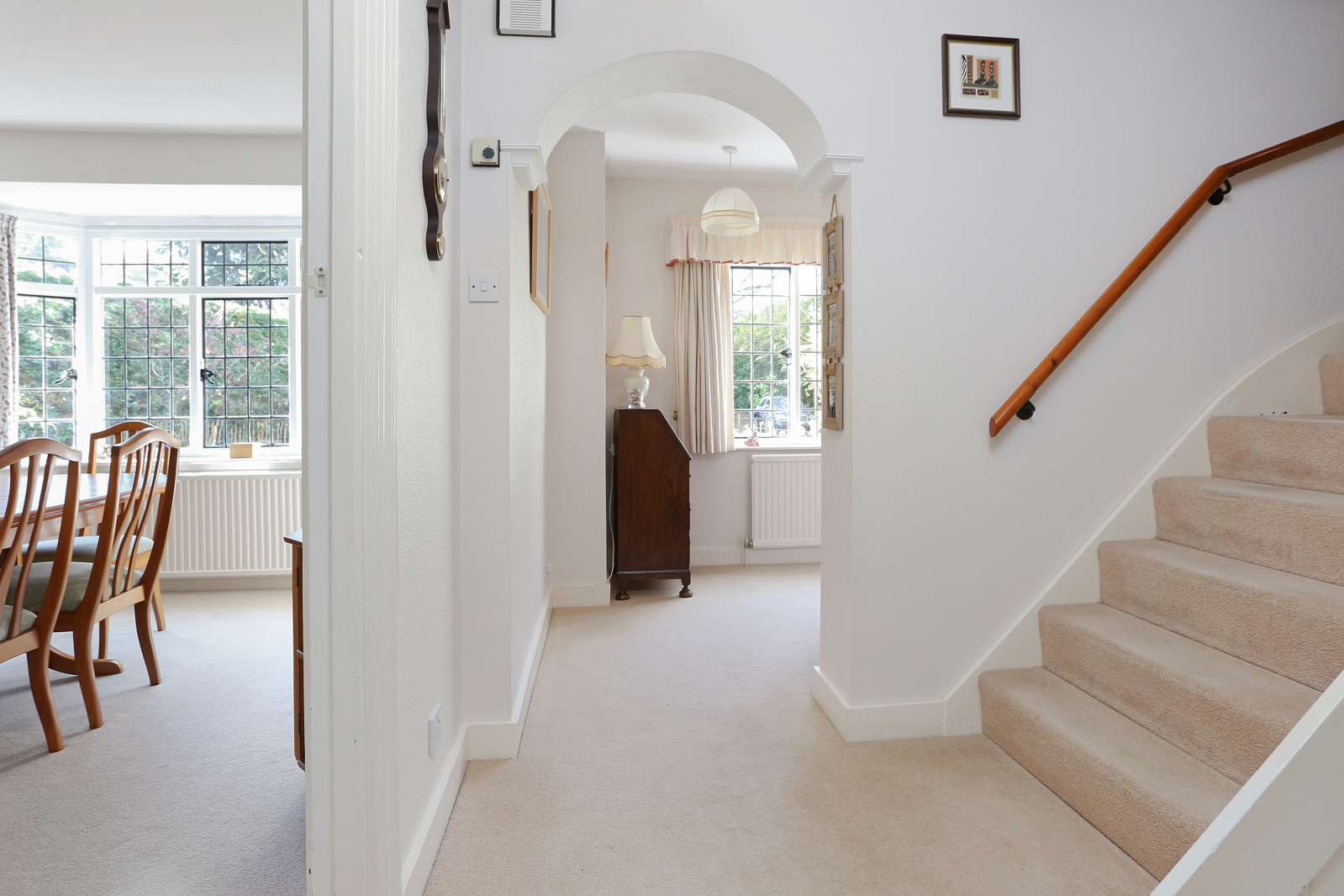 Ground Floor Front door to welcoming Reception Area and staircase leading to the first floor with useful cupboard and window seat. Cloakroom with two-piece suite and fitted cupboard. Rear aspect Sitting Room enjoying a delightful outlook over the rear garden and attractive window to side, log burning stove and hatch to kitchen. Arched alcove with display shelving and fitted cupboard. Front aspect Dining Room into attractive bay.