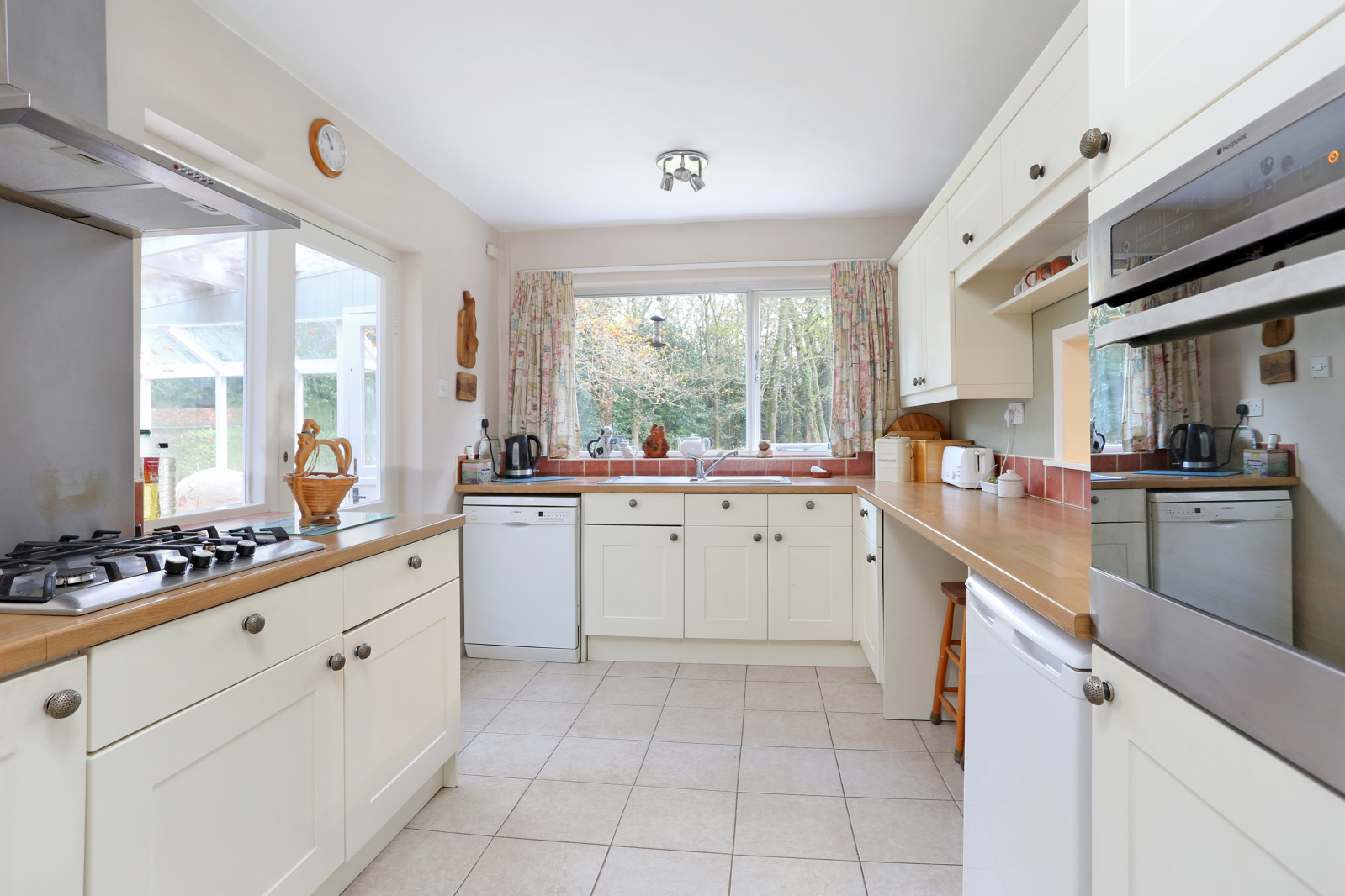 Kitchen enjoys lovely views to the rear and comprises sink unit, worktops, eye and base level units, breakfast bar, electric oven, gas hob and extractor hood, plumbing for dishwasher and space for fridge, gas fired boiler. Door to Conservatory enjoying views over the gardens. Doors front and rear, door to workshop and utility room with plumbing for washing machine, space for tumble drier and fridge/freezer.