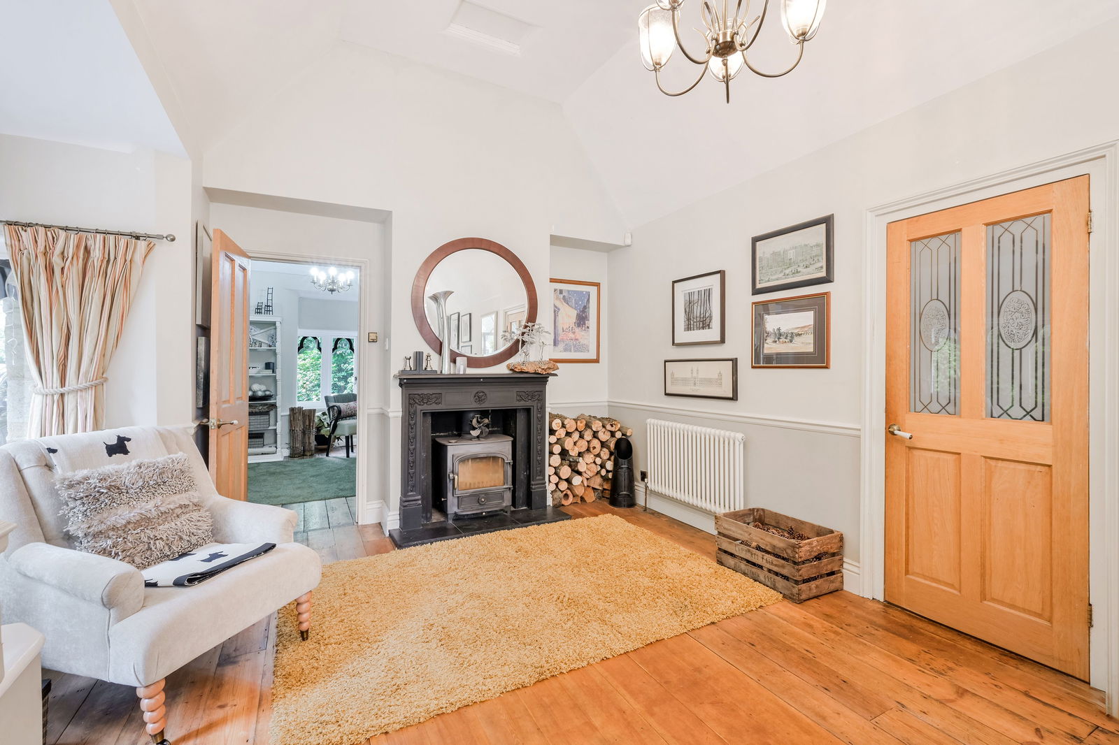 There is an ornate entrance canopy as you approach the property ideal for muddy welly boots. The front door leads you into a tasteful dining room with storage cupboards, adjoining the impressive lounge with high ceilings and Victorian fireplace with log burner. This then leads into a bright conservatory.