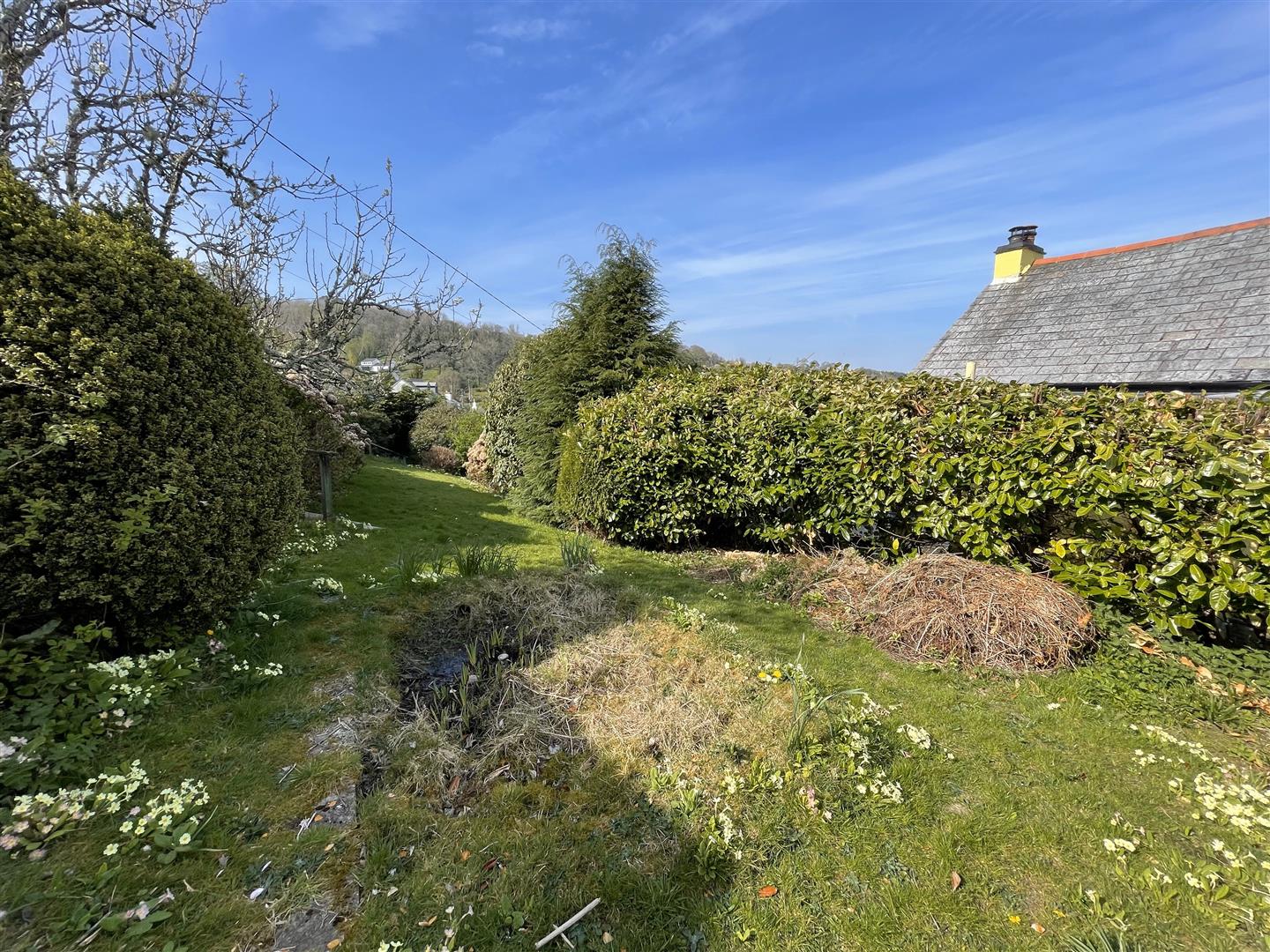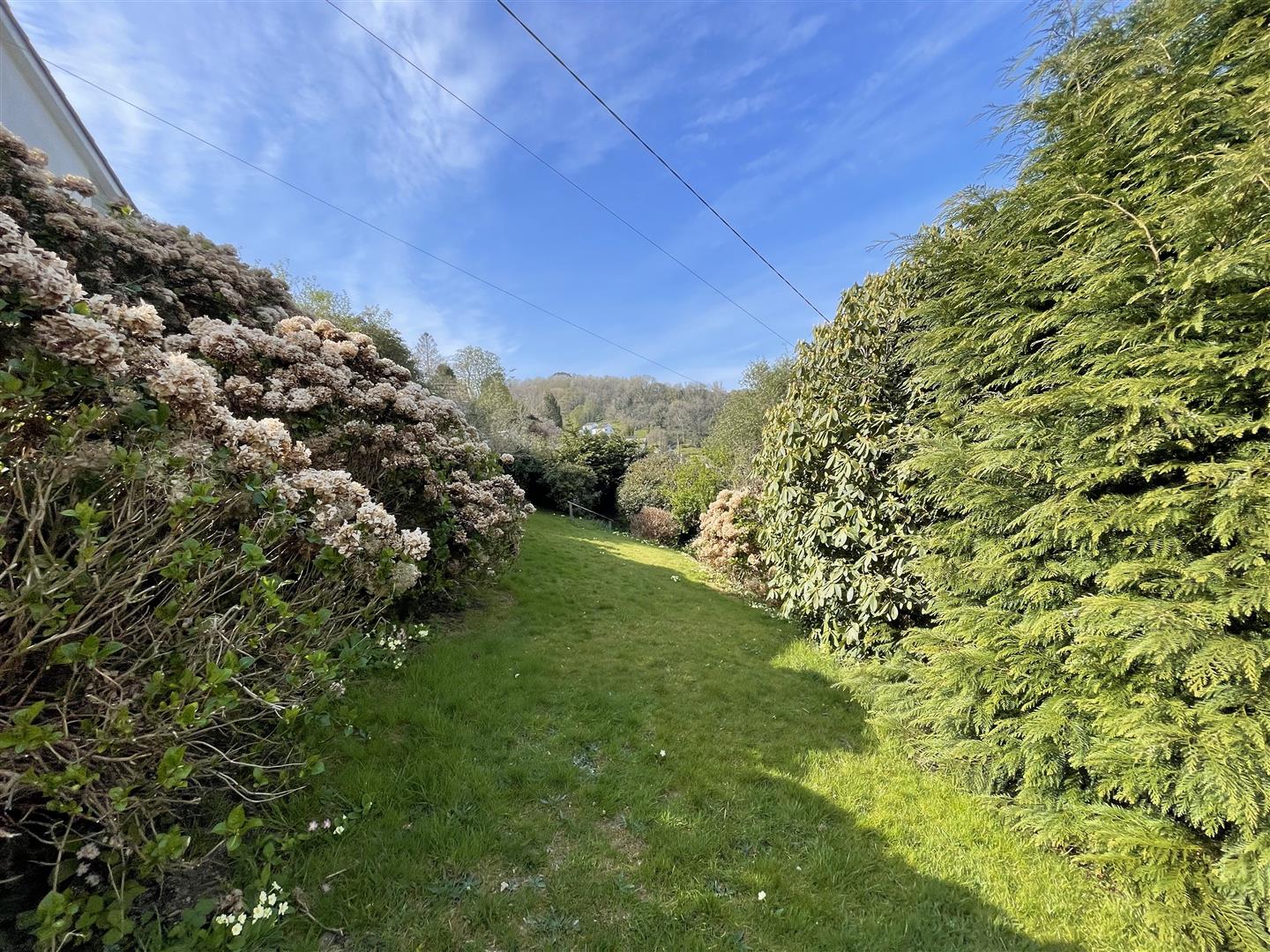 The pretty rear garden, like the front, is very deceiving in size, full of big beautiful Hydrangeas, plants, and shrubs, the plot is much larger than first imagined. To the side of the garden is a level lawn with a large greenhouse and a further lawned area runs across the property. From here a path meanders down to a gate that conveniently accesses School Hill.