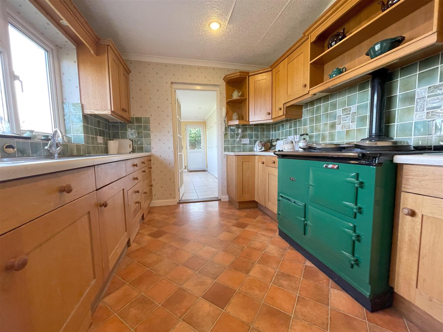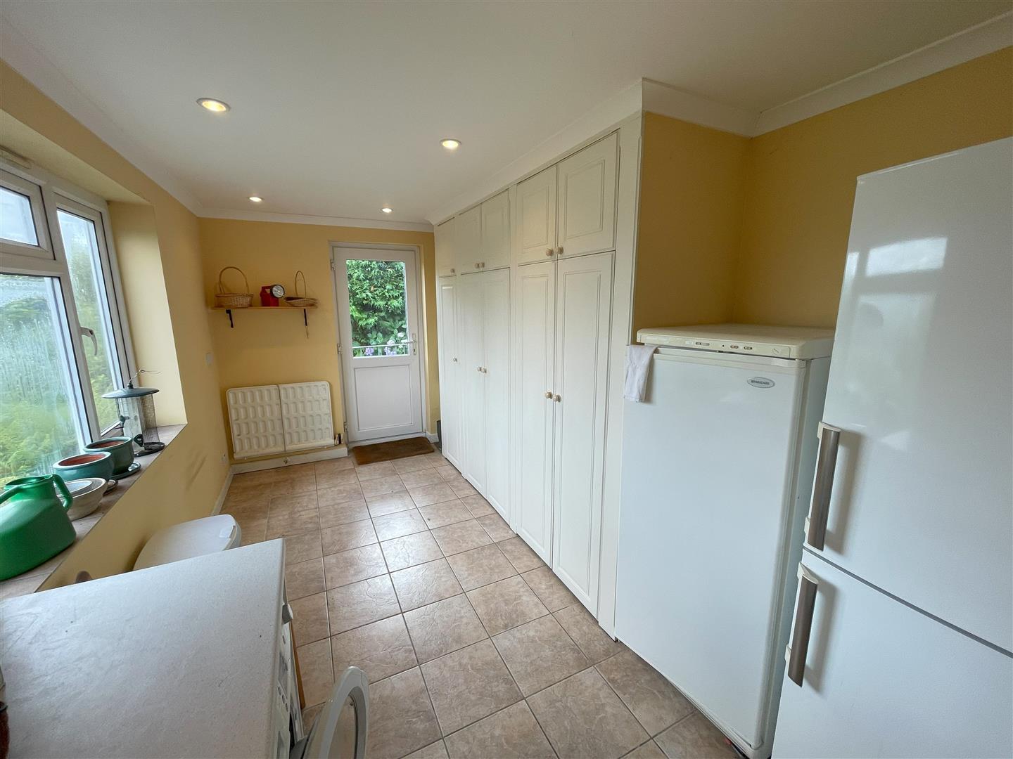 A covered roof protects the entrance from inclement weather and offers a useful space to take off muddy boots before entering the property. There is also an external storage cupboard housing the oil-fired boiler.