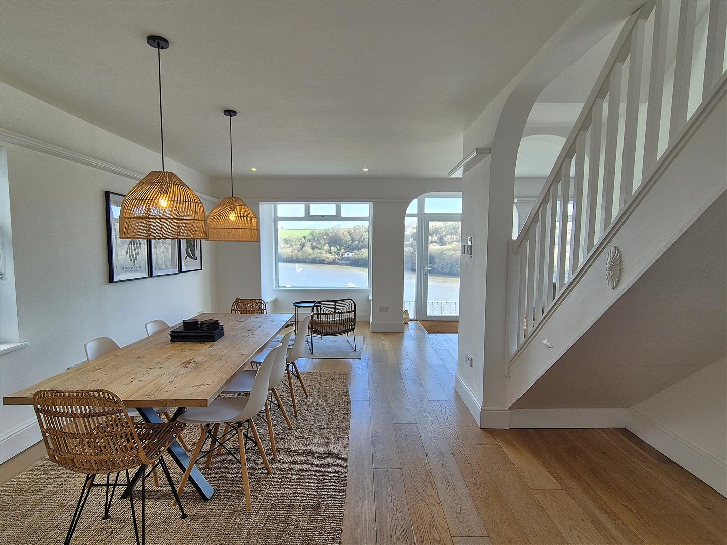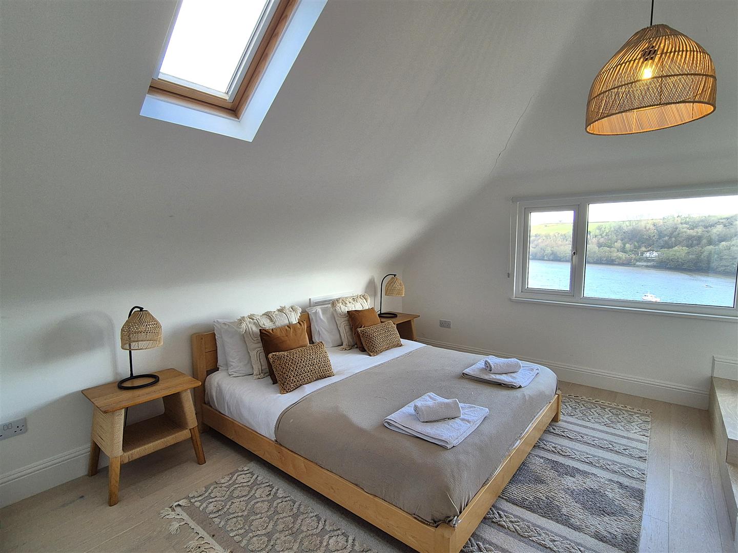 The Watchers is not a property to disappoint! The views from the light and airy open plan living room are magnificent. Large windows and a glass panelled door flood the room with light and give a largely unbroken view of Fowey estuary with the countryside beyond. This spacious room has a designated sitting area, dining area and kitchen, brought together by engineered oak flooring.