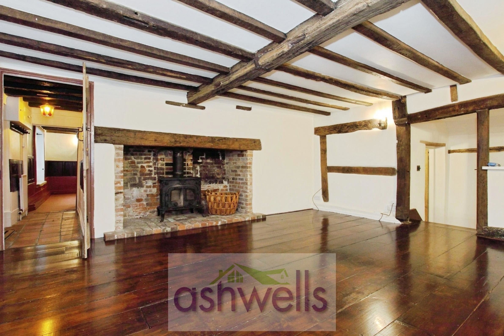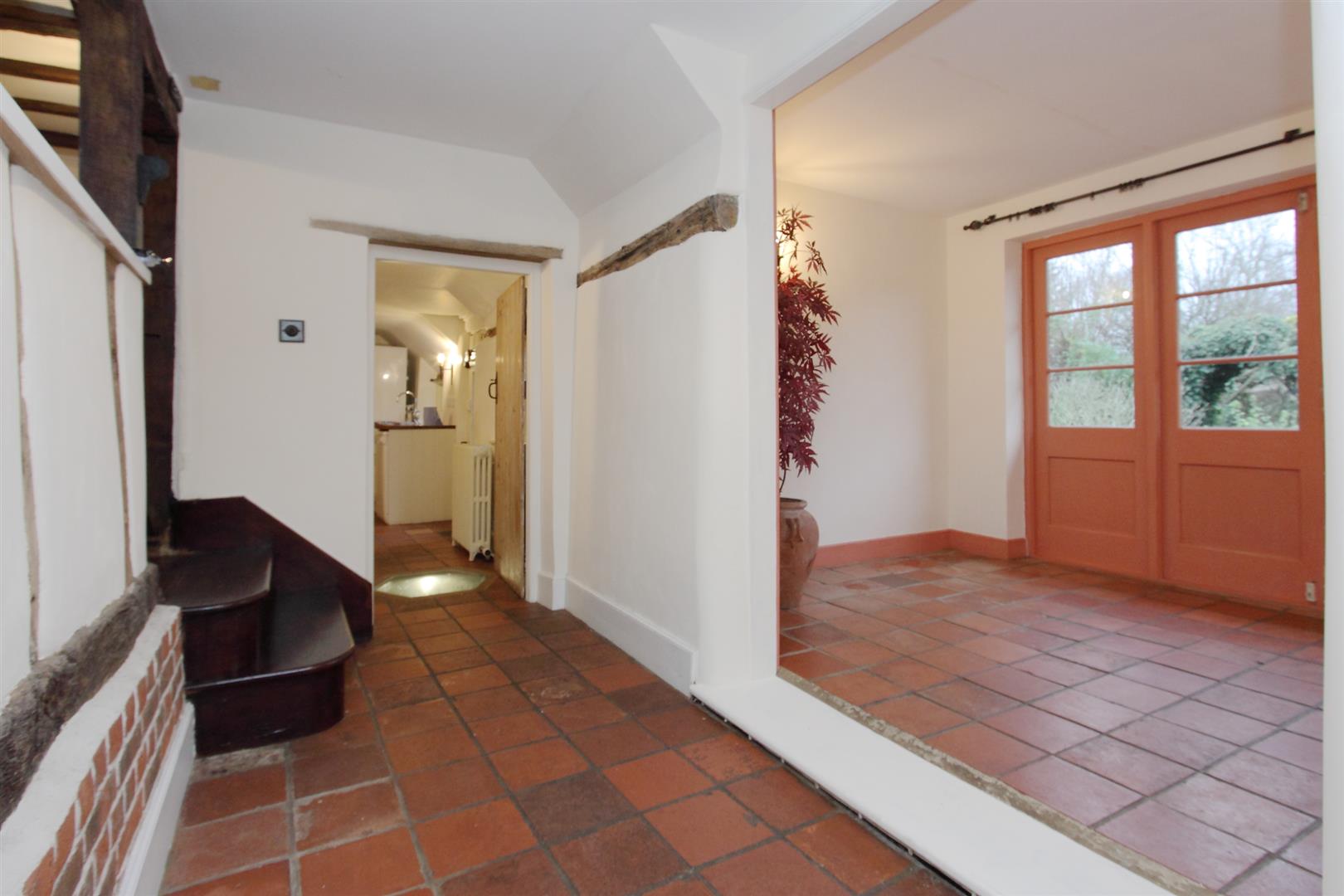 Entrance Hall - Wooden panel front door into entrance hall. Coir mat at threshold. Flagstone flooring with original exposed beams and timbers. Doors into drawing room and sitting room.