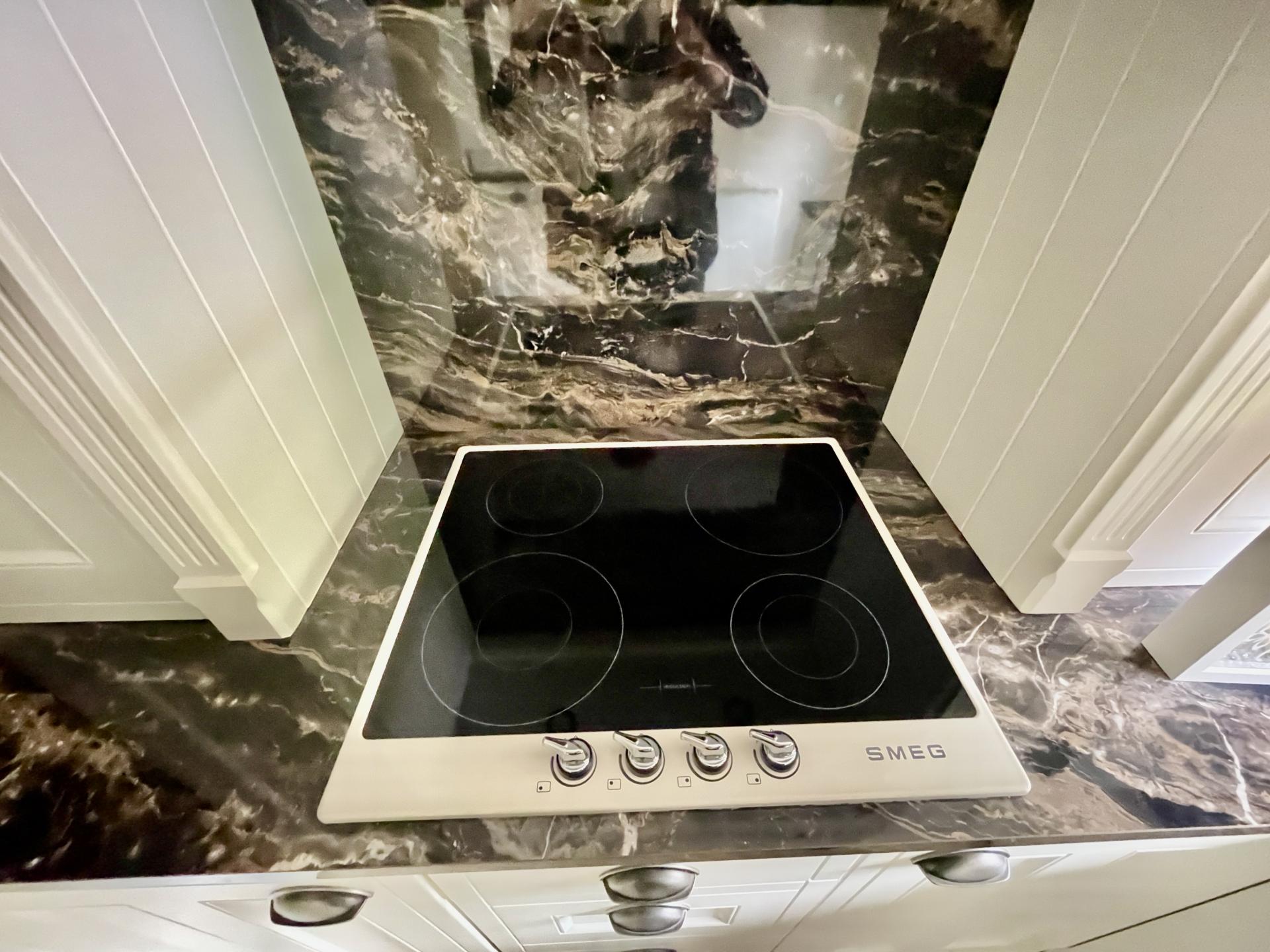 KITCHEN 9' 0" x 8' 9" (2.75m x 2.68m) UPVC double glazed window to the side elevation, skimmed ceiling, centre spotlight fitment, electric storage heater, alarm controls, porcelain tiled flooring, fitted with a wide range of base and drawer units, work surfaces over, splashbacks, inset circular bowl sink with mixer tap, integrated Smeg double fan assisted electric oven, dresser included in sale. Obscured UPVC double glazed door into: