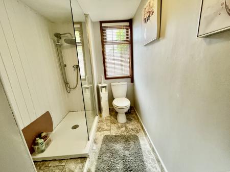 SHOWER ROOM 5' 6" x 11' 5" (1.68m x 3.50m) UPVC double glazed window to the front elevation, skimmed ceiling, 2 centre light points, porcelain tiled flooring, fitted with a three piece suite comprising low level WC, wash hand basin with taps, walk-in shower enclosure with fitted thermostatic shower over with rainfall shower head and shower attachment tap, double doors to: