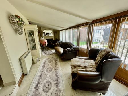 DAY ROOM 8' 5" x 22' 4" (2.58m x 6.81m) UPVC double glazed French doors to the rear elevation, UPVC double glazed windows to the rear elevation, porcelain tiled flooring, radiator, 2 electric storage heaters, feature fireplace with wooden surround and fitted multi fuel burner, TV point. Opening into: