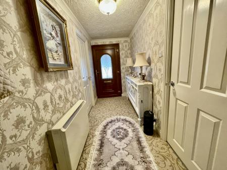 ENTRANCE HALLWAY 4' 7" x 13' 4" (1.41m x 4.07m) Obscured UPVC double glazed door to the front elevation leading into Porch, coved and textured ceiling, centre light point, electric storage heater, storage cupboard off with slatted shelving.