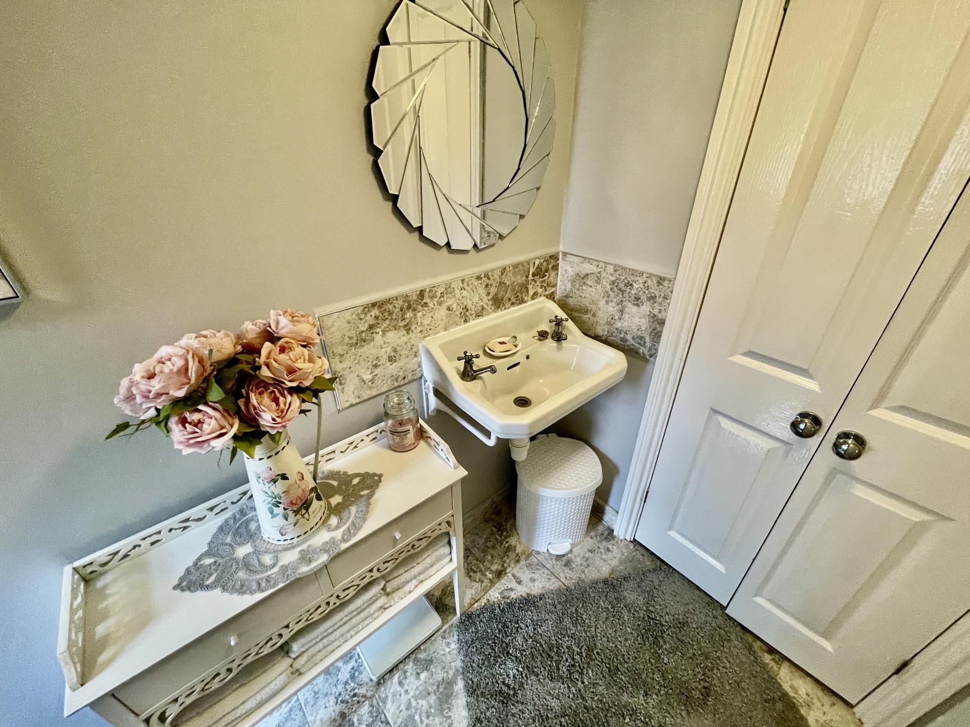 FAMILY BATHROOM 10' 1" x 12' 6" (3.09m x 3.82m) Obscured UPVC double glazed window to the side elevation, skimmed and coved ceiling, decorative ceiling rose, centre light point, porcelain tiled flooring, electric storage heater, fitted with a three piece suite comprising low level WC, pedestal wash hand basin with taps and roll top bath with claw feet and telephone shower mixer tap.