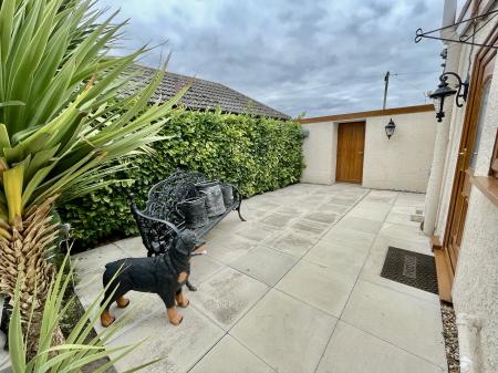 SIDE GARDEN 2 lantern lights, extensive patio with brick pillared walling, double external sockets, extensive lighting.