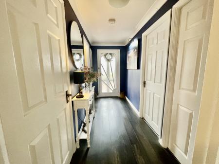 ENTRANCE HALLWAY Skimmed and coved ceiling, centre light point, smoke alarm, BT point, vinyl plank flooring, storage cupboard off housing hot water cylinder with slatted shelving. Door into:
