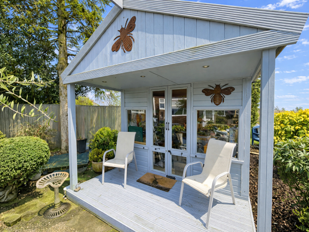 WORK FROM HOME OFFICE/SUMMERHOUSE Decking area, double doors to the front, 2 windows to the front, window to the side, insulated, vinyl floor covering, various power points with USB charging points.