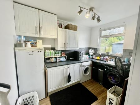 UPVC double glazed window to the rear elevation, skimmed ceiling, centre light point, access to loft space, oak effect laminate floor, fitted with a wide range of base and eye level units, work surfaces over, tiled splashbacks, inset stainless steel sink with mixer tap, plumbing and space for washing machine, space for tumble dryer, space for fridge freezer, door to: