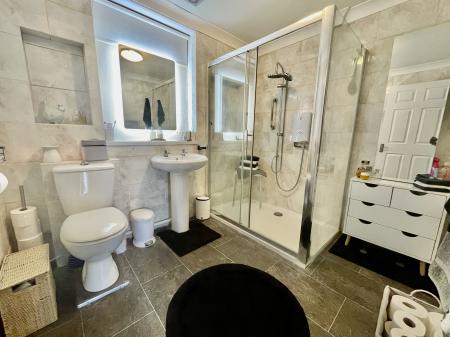 SHOWER ROOM 7' 8" x 8' 5" (2.35m x 2.59m) Obscure UPVC double glazed window to the rear elevation, skimmed and coved ceiling, centre light point, extractor fan, fitted with a three piece suite comprising low level WC, pedestal wash hand basin with taps, double shower cubicle with fitted Triton shower over with double rain fall shower head and further shower attachment tap, stainless steel heated towel rail, fully tiled walls, illuminated mirror.
