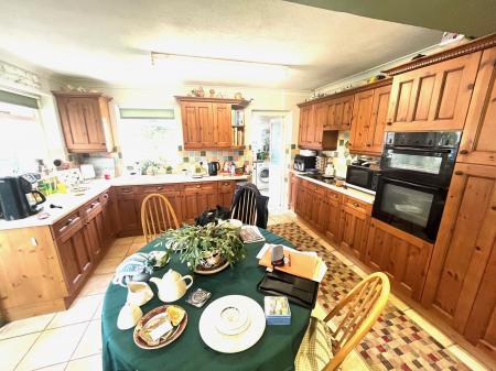BREAKFAST KITCHEN 16' 5" x 13' 5" (5.02m x 4.11m) Extensive range of fitted units comprising base cupboards and drawers beneath the roll edged worktops with one and a quarter bowl single drainer sink unit with mixer tap, intermediate wall tiling, matching eye level wall cupboards with end display shelves, fitted electric double oven, 4 ring electric hob with concealed cooker hood above. Ceramic floor tiles, fluorescent strip light, recessed ceiling lights, radiator, timber framed single glazed windows to the rear and side elevations, door to: