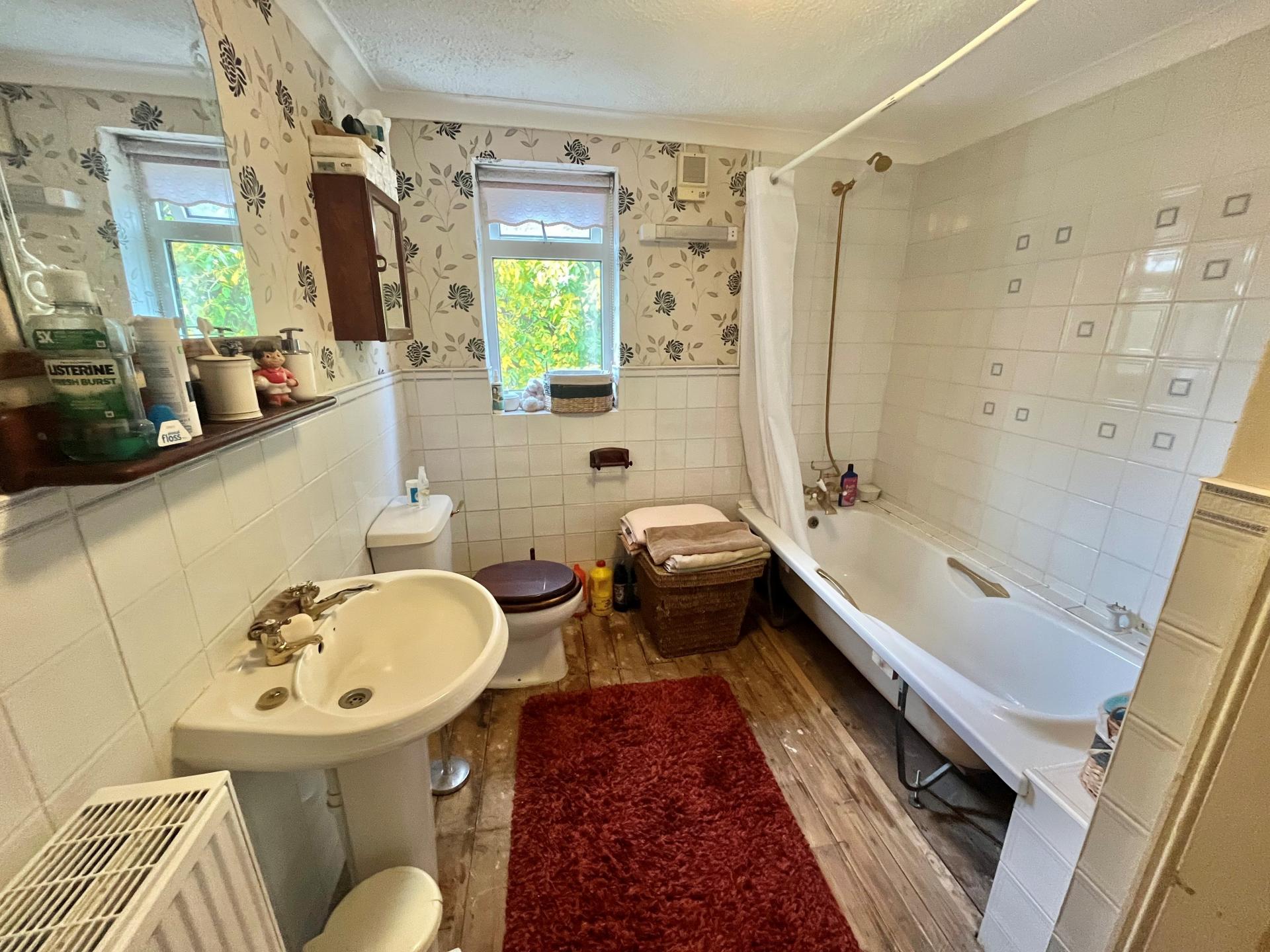 BATHROOM 10' 2" x 7' 8" (3.10m x 2.35m) Half tiled walls, fitted three piece suite comprising bath with mixer tap and shower attachment, pedestal wash hand basin, low level WC, radiator, coved and textured ceiling, ceiling light, shaver point with courtesy light, UPVC window, Airing Cupboard housing the hot water cylinder and solar panel controls.