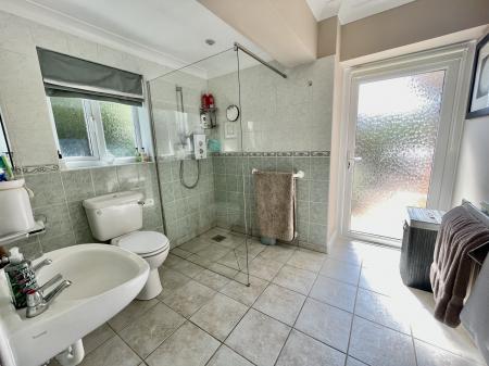 WET ROOM 8' 9" x 7' 11" (2.69m x 2.43m) Obscure UPVC double glazed window to the side elevation, obscure UPVC double glazed door to the front elevation, coved ceiling, inset downlighters, tiled flooring, extractor fan, fully tiled walls, double radiator, medicine cabinet, fitted with a three piece suite comprising low level WC, wash hand basin with taps, glass shower screen and new shower fitted.