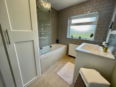 REFITTED FAMILY BATHROOM 6' 11" x 9' 0" (2.13m x 2.76m) Obscure UPVC double glazed window to the side elevation, skimmed ceiling, inset LED lighting, centre spotlight fitment, access to loft space, radiator, ceramic tiled flooring, fitted with a two piece suite comprising wash hand basin fitted into vanity unit with storage below, bath with shower screen and fitted Triton power shower over. Storage cupboard off housing hot water cylinder, gas boiler, slatted shelving.