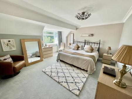 MASTER BEDROOM 12' 5" x 14' 8" (3.79m x 4.49m) UPVC double glazed window to the front elevation, skimmed ceiling, inset LED lights, centre light point, telephone point, radiator, TV point, fitted wardrobes with hanging rail and shelving.