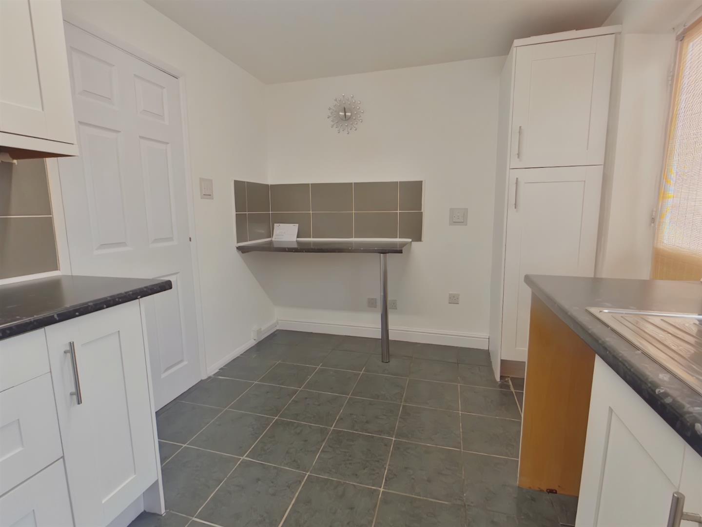 Kitchen - 3.84m x 2.49m (12'7 x 8'2) - Textured ceiling, PVCu triple glazed window to rear elevation, re-fitted range of wall and base/drawer units with work surface over, sink, tiled flooring, electric oven with hob and hod over, plumbing for washing machine, space for fridge/freezer, extra workspace for potential breakfast bar. Door to: