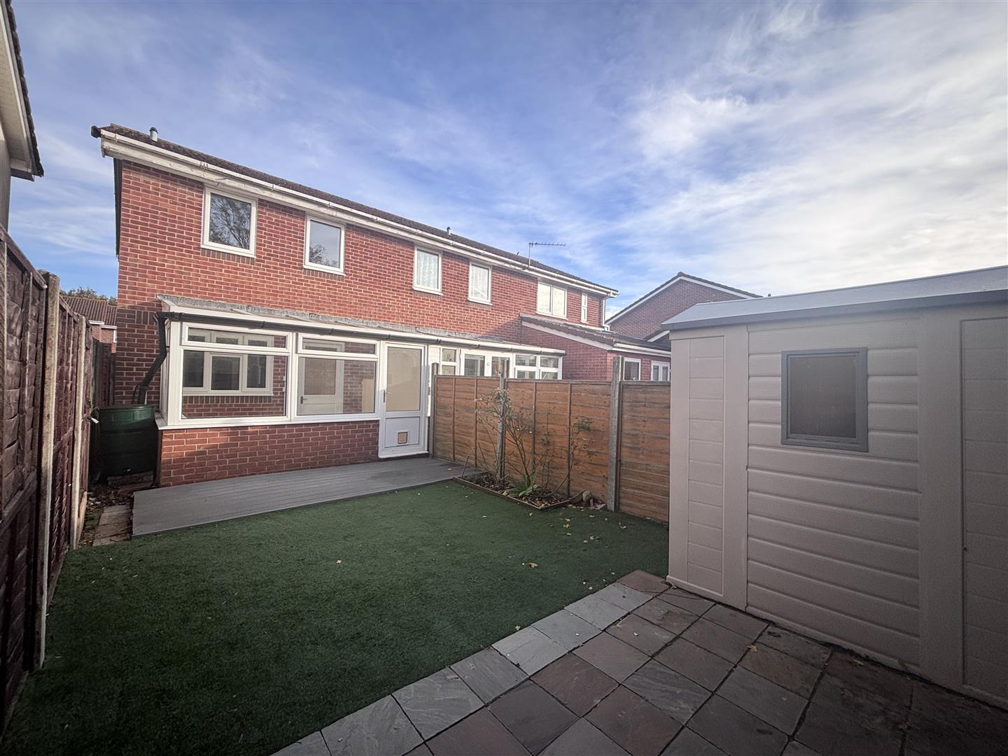 Rear Garden - A full enclosed westerly facing low maintenance rear garden mainly laid to decking, patio and AstroTurf, shed, border area with plants ,side gate.
