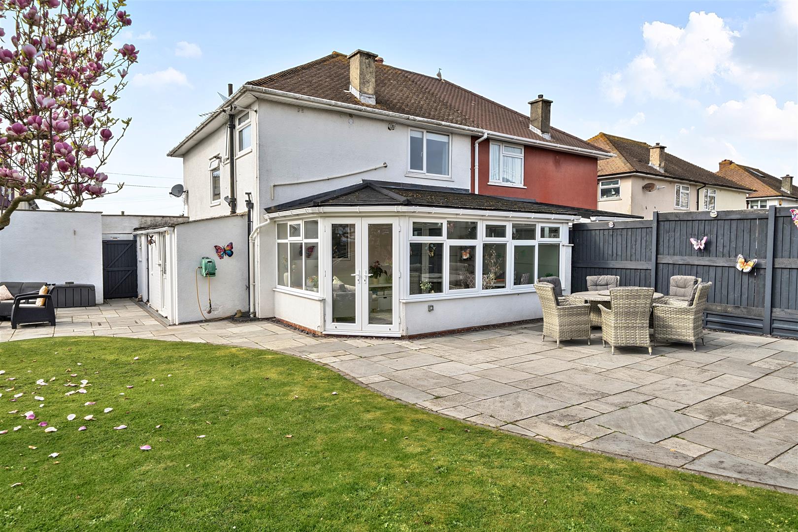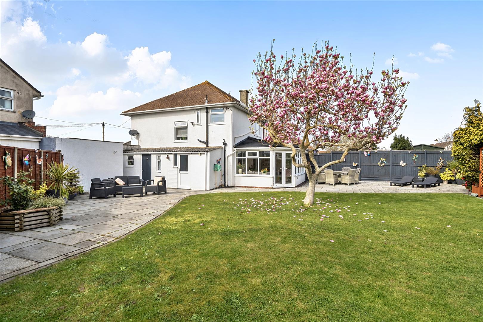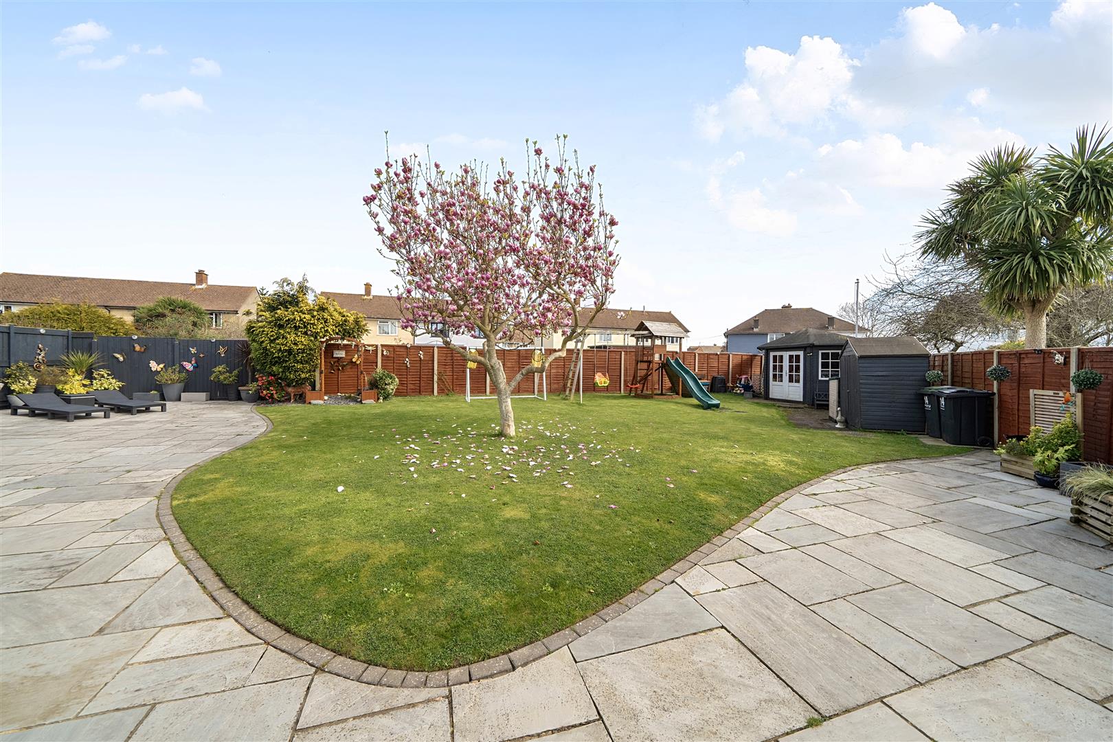 - Large rear garden with patio, shed, and summer house