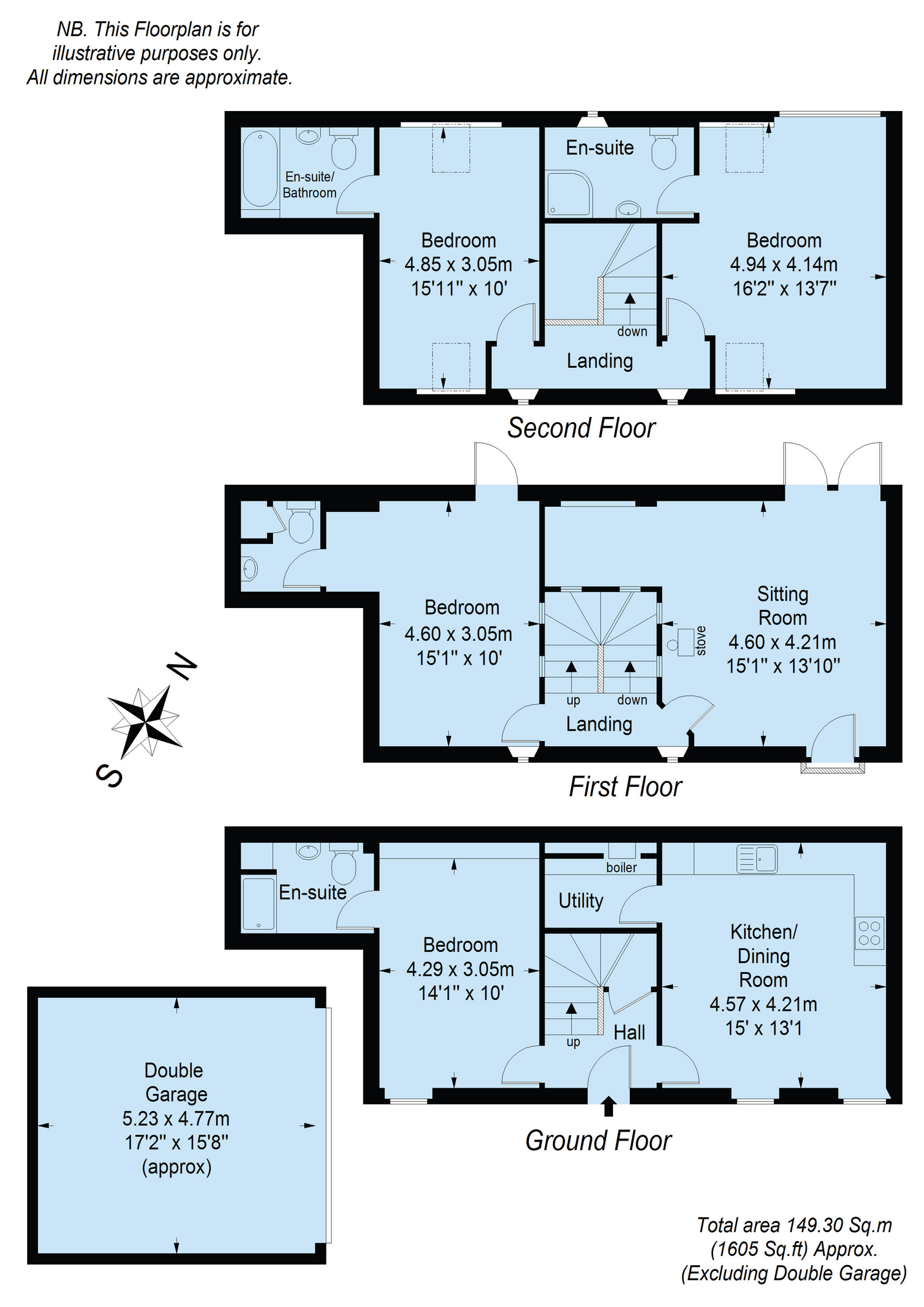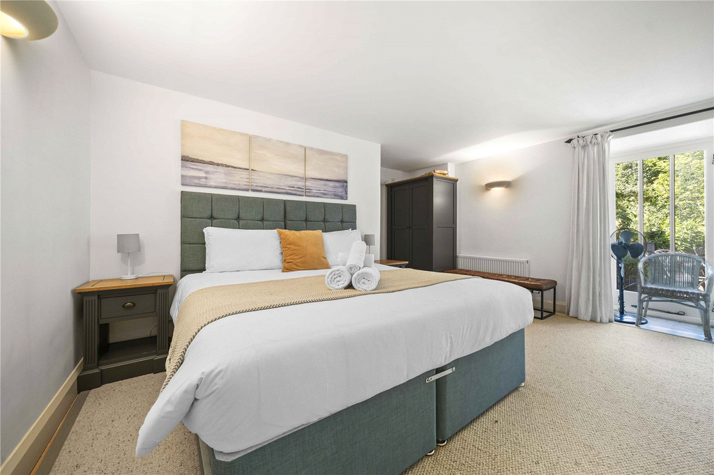 The property offers a unique blend of modern luxury and rustic charm and features bright and inviting accommodation arranged over 3 floors. On the ground floor you enter the hall which has stairs to the first floor and under stair storage. To your left is one of the 4 double bedrooms with en-suite shower room, and to your right is the kitchen/dining room, they both overlook the communal courtyard. In the kitchen you’ll find plenty of fitted floor and wall units with granite worktops, integrated appliances including a new Miele extractor fan and oven with integrated air fryer and new splash-back. Off the kitchen is a very useful utility room which also houses the boiler. On the first floor is another double bedroom with wc and the sitting room, which is dual aspect with a Juliette balcony and French doors opening to the garden. On the second floor are a further 2 en-suite double bedrooms with vaulted ceilings and exposed roof trusses.