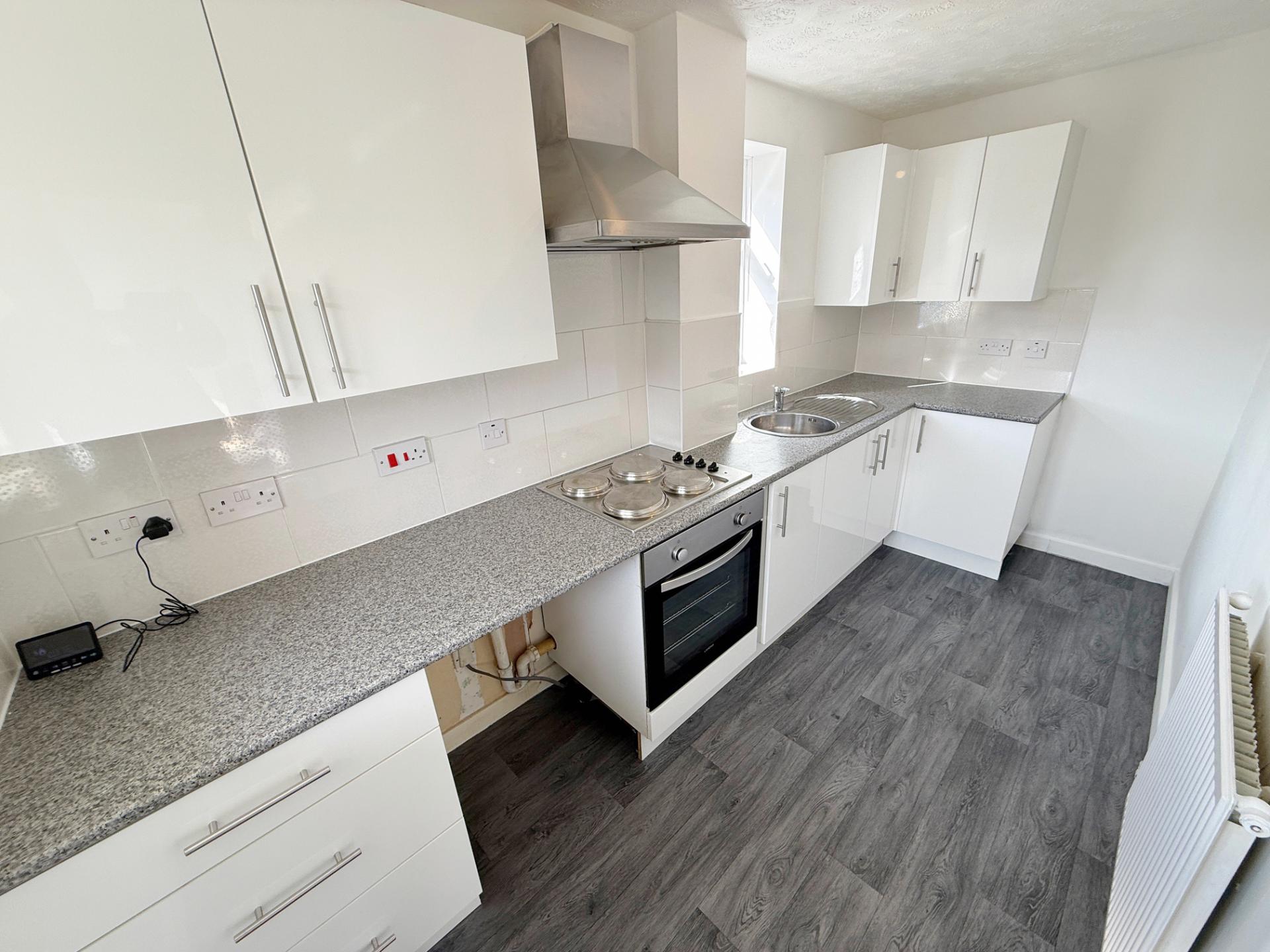 With uPVC double glazed windows to front and side elevations, ceiling light point and having a range of base and eye level Kitchen units with breakfast bar area, rolled edge worktop incorporating a stainless steel sink and drainer with hot and cold mixer tap over, tiled splashbacks, space for fridge/freezer, recess and plumbing for washing machine, 4 ring hob with electric oven under and extractor over.
