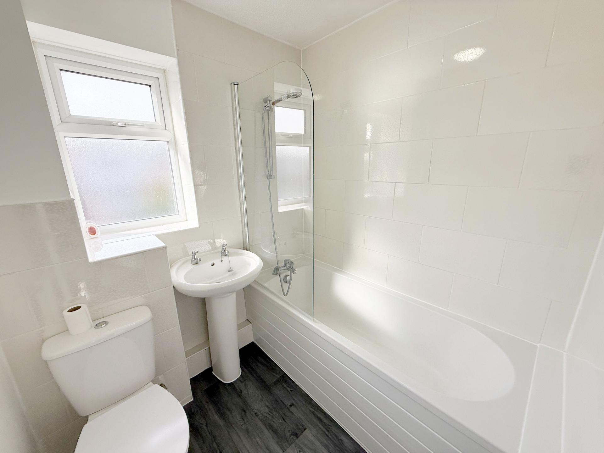 With obscure uPVC double glazed window to side elevation, ceiling light point and three piece white suite comprising panelled bath with shower over and shower screen, pedestal wash hand basin inset into vanity unit and low flush wc.