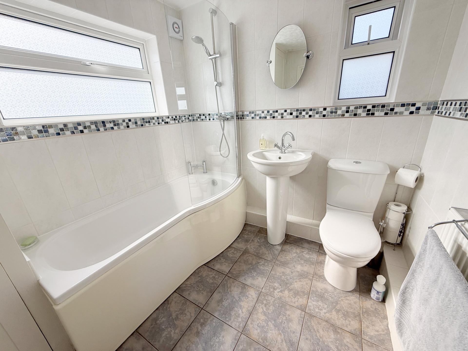 With obscure uPVC double glazed windows to side and rear elevations, airing cupboard housing gas fired boiler, being largely tiled and having contemporary 3 piece white bathroom suite comprising panelled bath with shower over, low flush wc and pedestal wash hand basin.