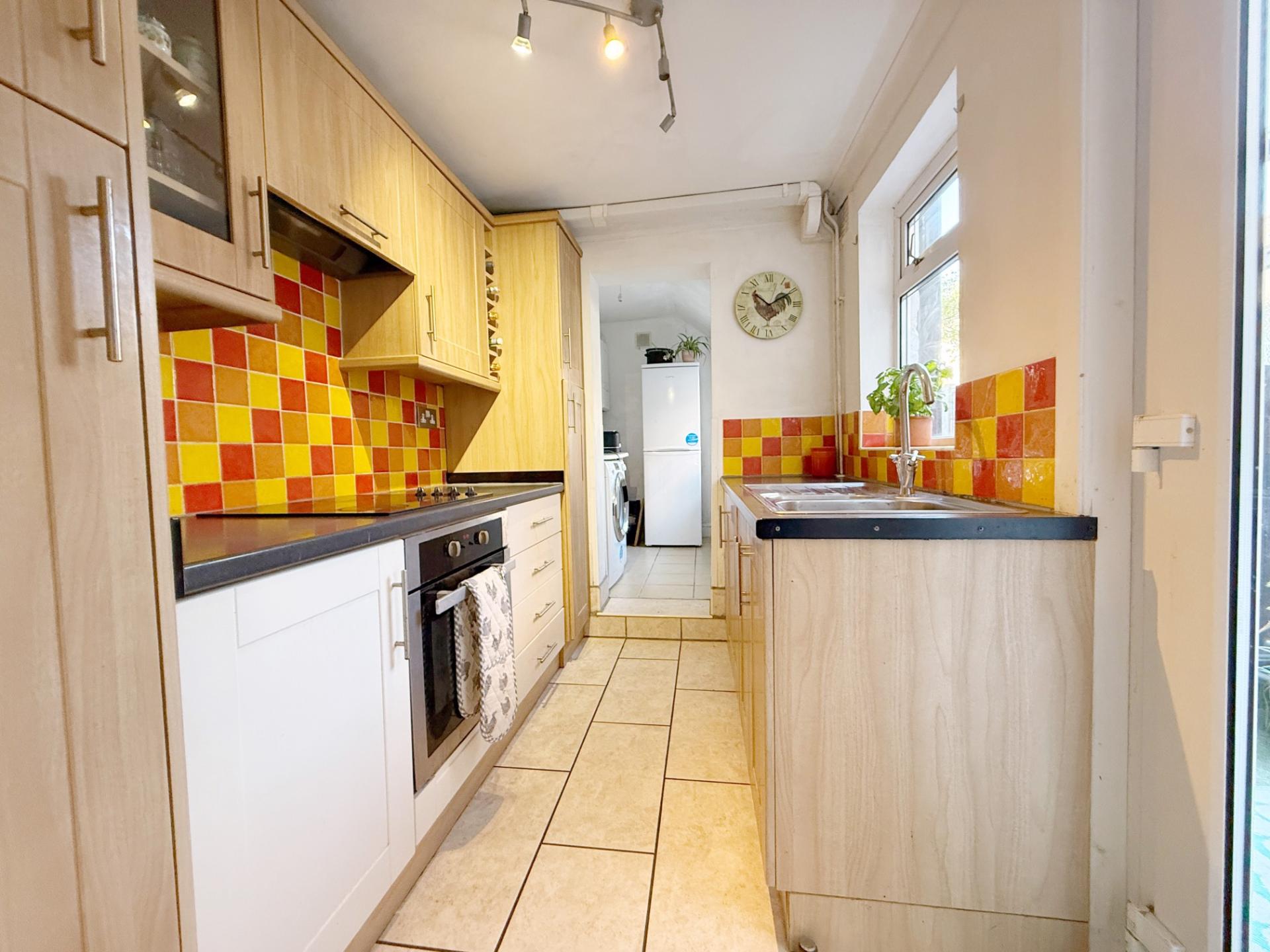 With uPVC double glazed window to side, rolled edge worktop with space and plumbing for washing machine and dryer, wall mounted gas fired boiler and tiled flooring.