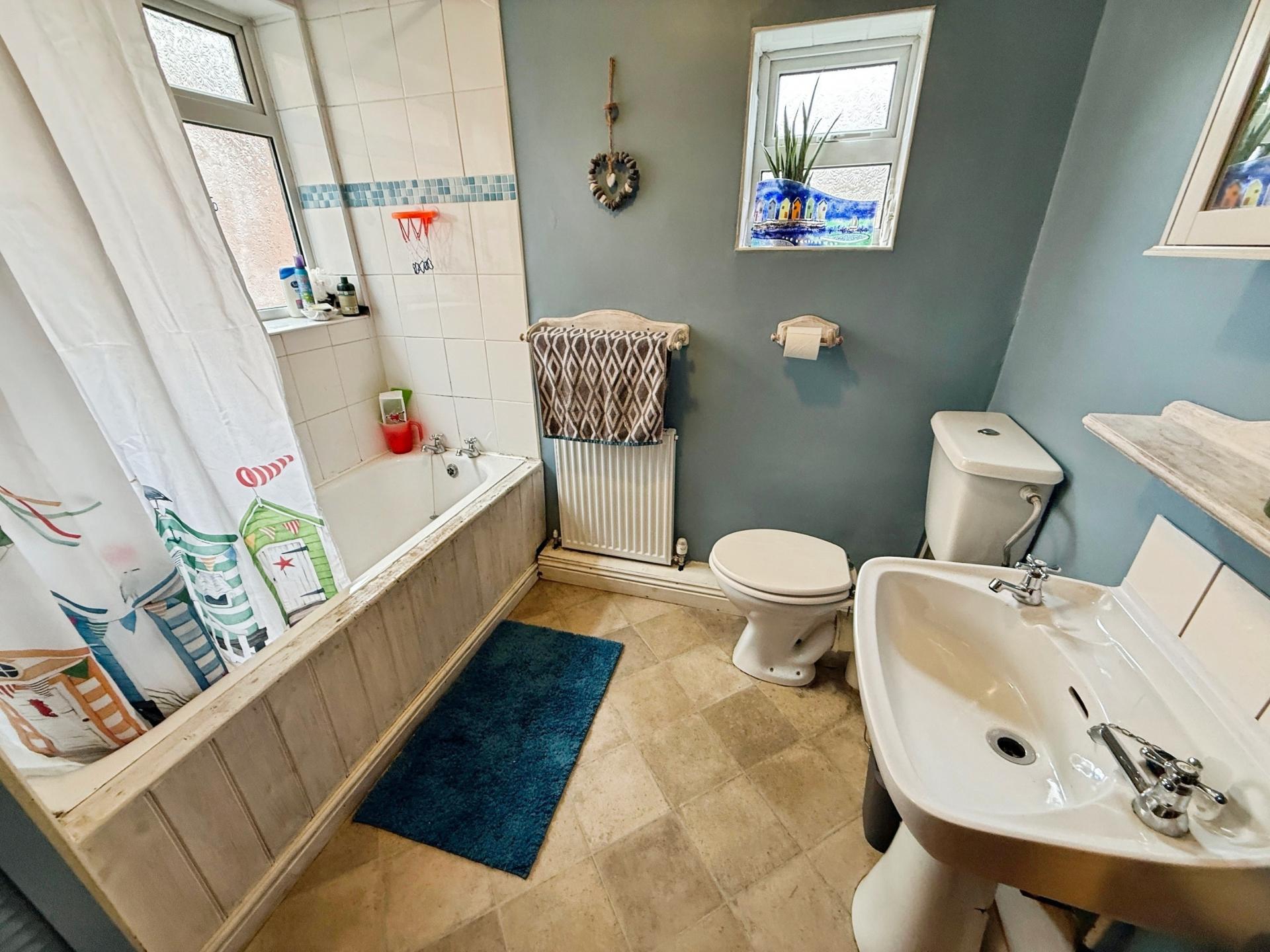With airing cupboard, uPVC double glazed windows to side and rear elevations, 3 piece suite comprising panelled bath with shower over, pedestal wash hand basin and low flush wc.