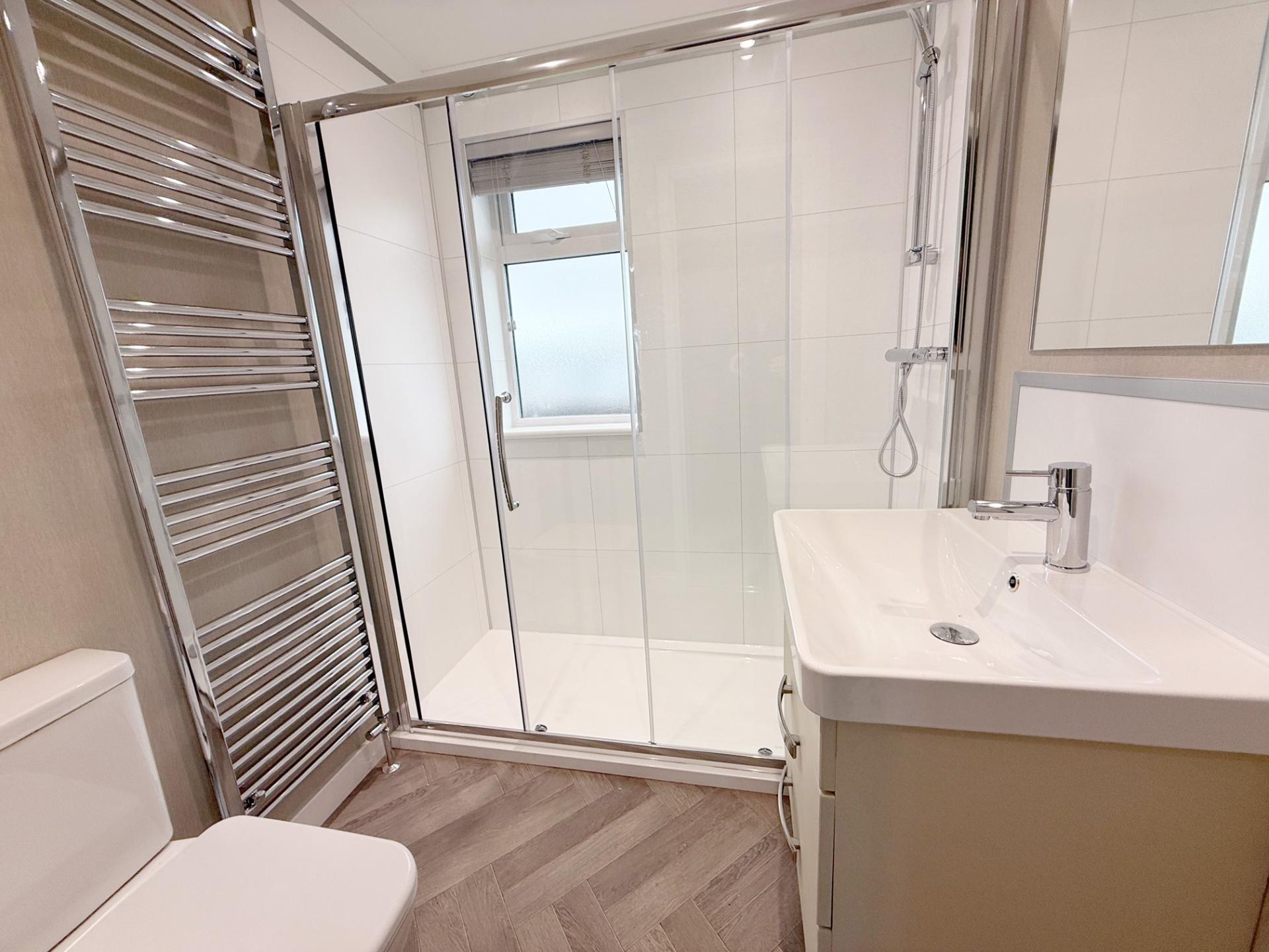 With obscure uPVC double glazed window to side, heated towel rail, shower cubicle with shower unit, wash hand basin and low flush wc.