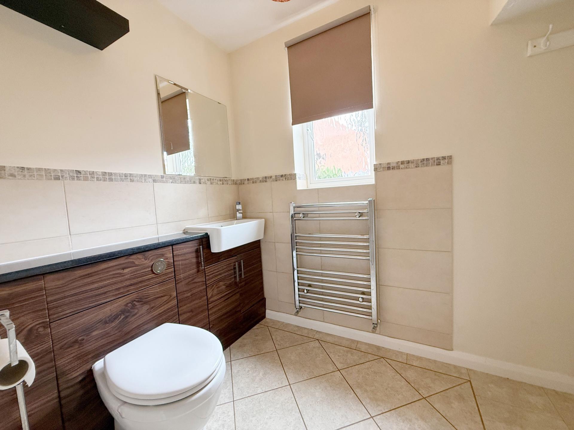 With a four-piece suite comprising shower cubicle with fitted power shower, panelled bath, low flush wc. and wash-hand basin with contemporary tiling to walls and heated towel rail.