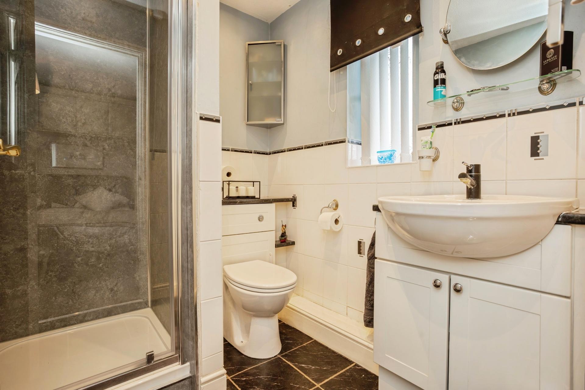 With obscure uPVC double glazed window to front elevation, recessed lighting, heated towel rail and three piece suite comprising shower cubicle with shower boarding and mains fed shower, wash hand basin inset into vanity unit and low flush wc.