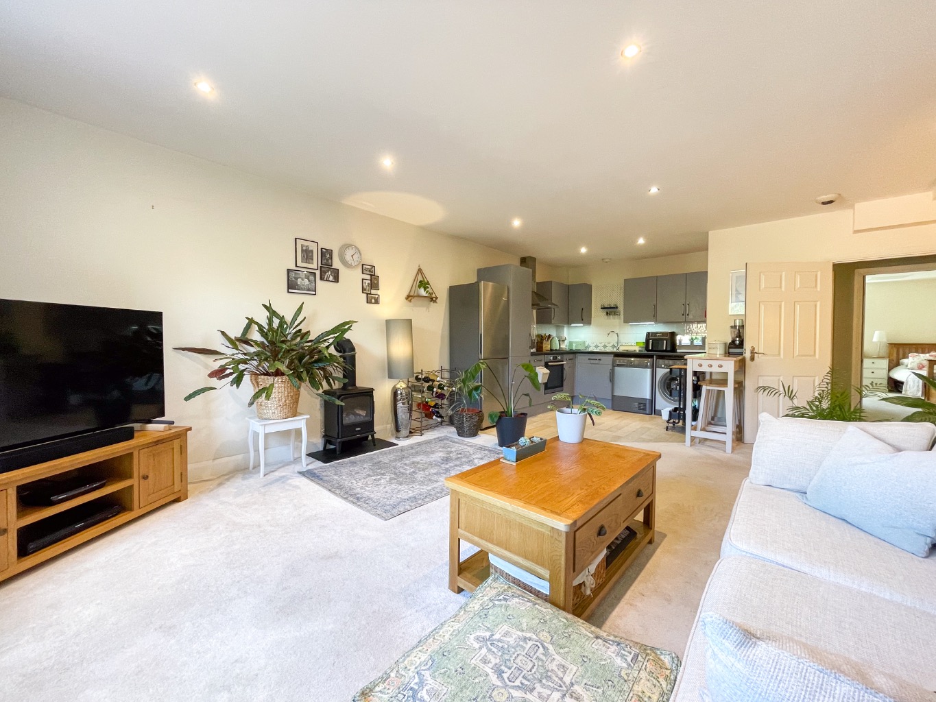 The accommodation comprises a welcoming entrance hall leading into a spacious open-plan living and dining area, seamlessly connected to a well-sized kitchen. The kitchen features an integrated oven and induction hob, and comes complete with a washing machine and tumble dryer.