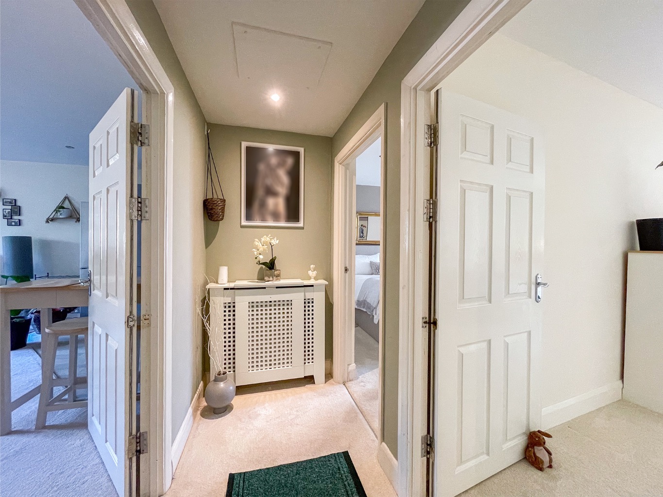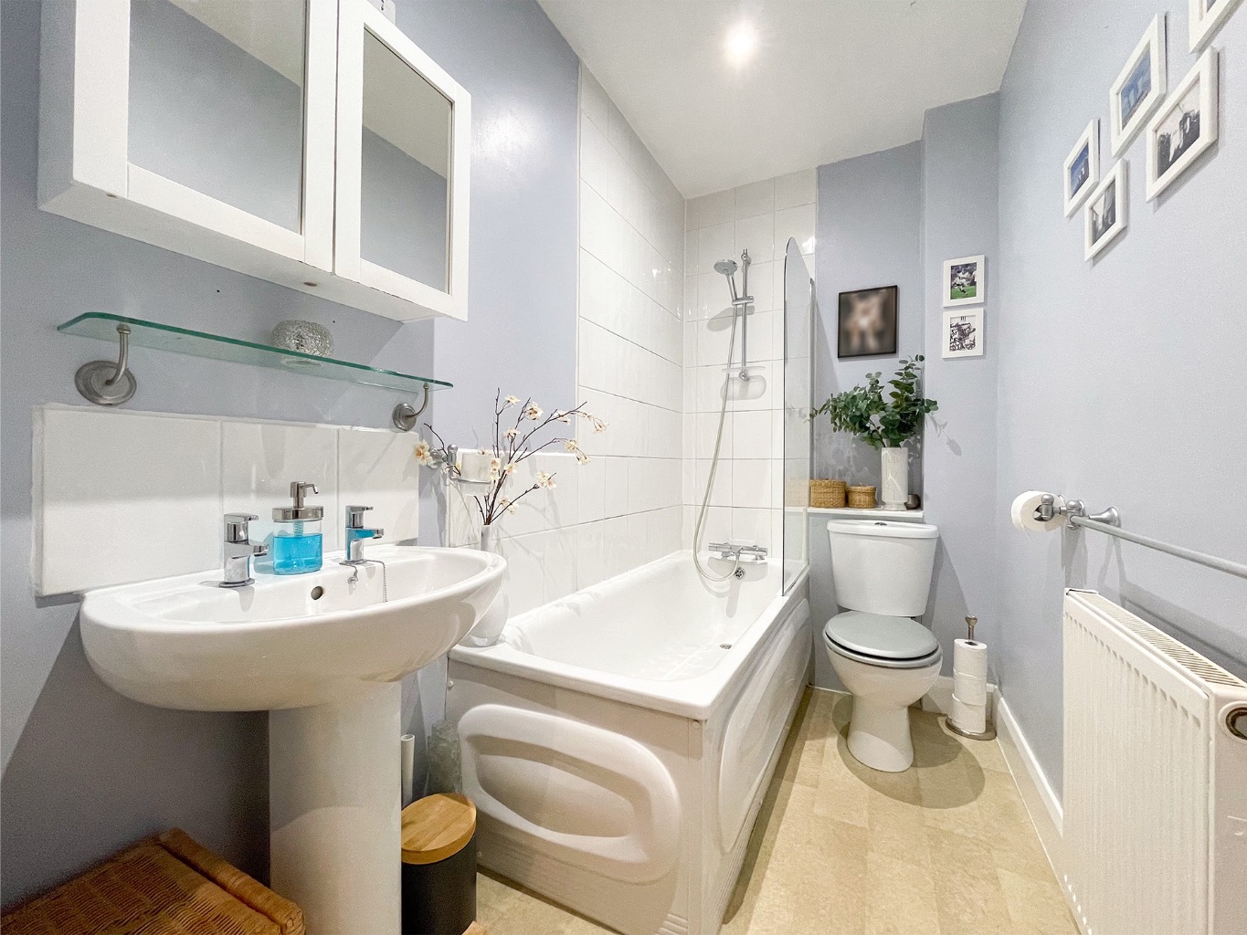 There are two generously proportioned double bedrooms, and a modern family bathroom fitted with a pristine three-piece suite, shower over the bath, and a sleek glass screen. Additional touches include made-to-measure window blinds throughout.
