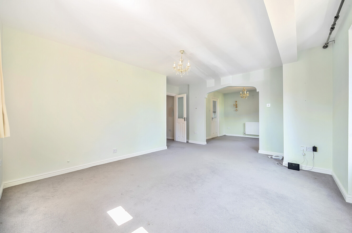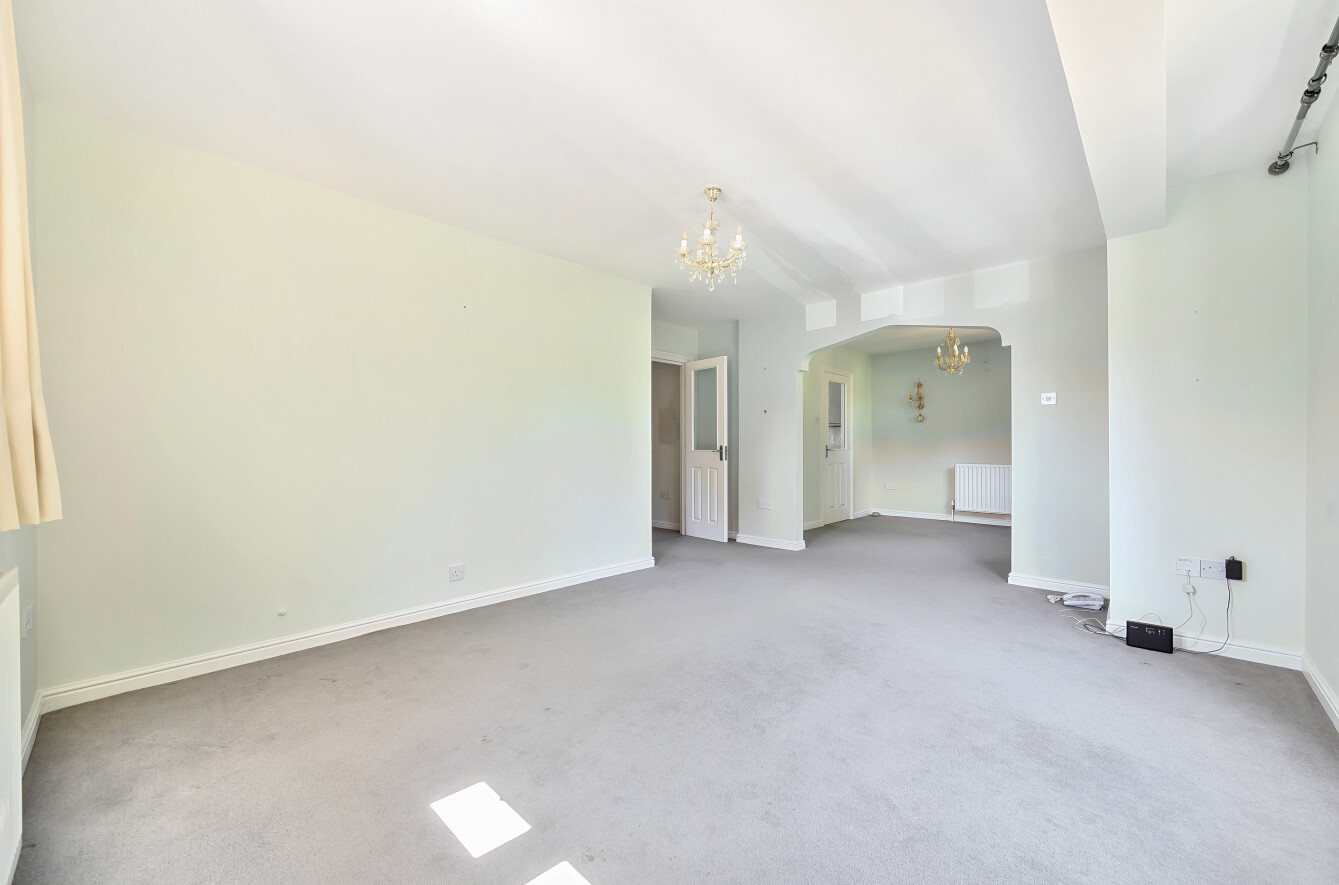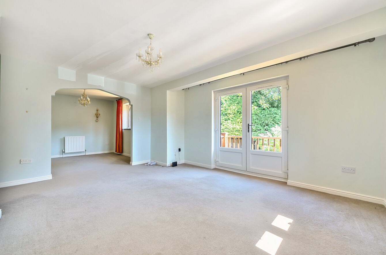 A dining room leads through a pretty archway onto a wonderfully bright and spacious living room with patio doors onto a small private balcony overlooking a garden