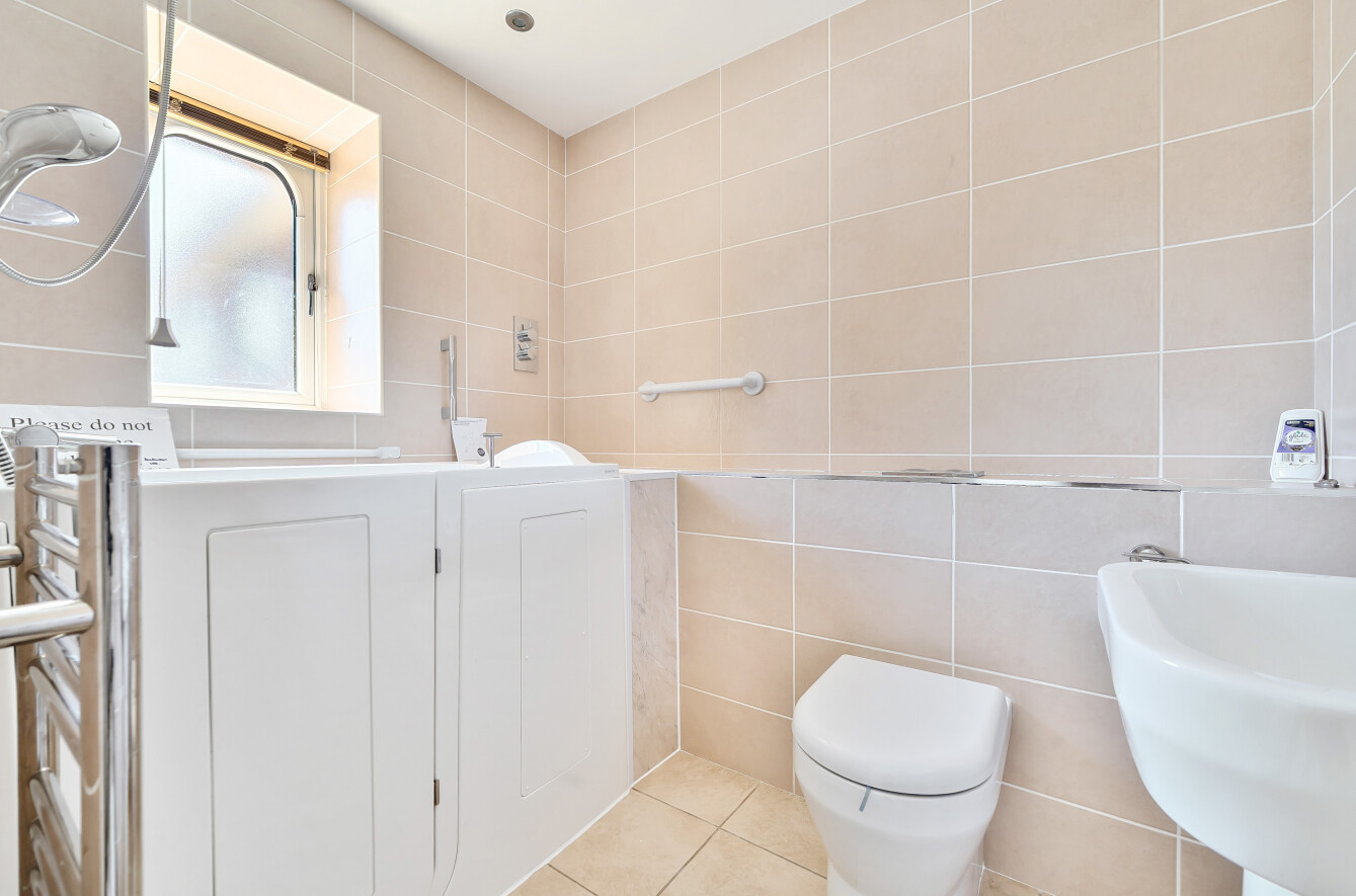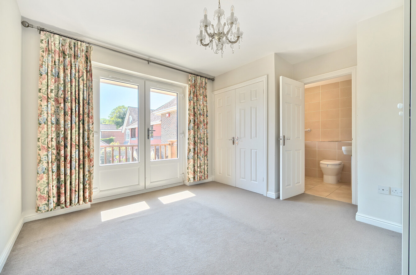 The master bedroom has fitted wardrobes and also benefits from patio doors onto a small balcony. An modern ensuite bathroom has a walk-in bath with hand held showers