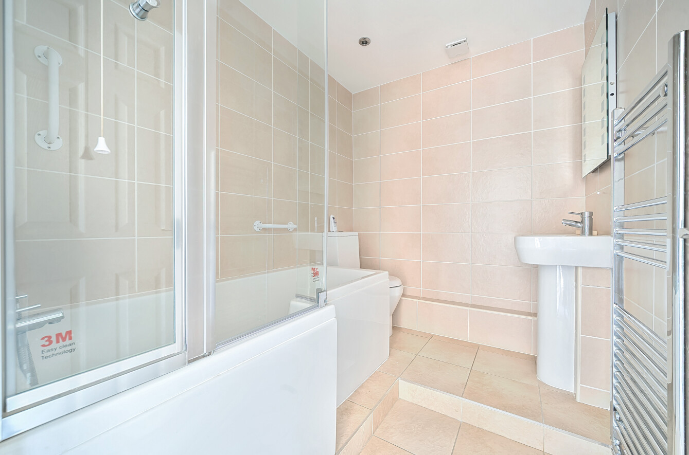 The main bathroom is fully tiled with a modern bath with shower over