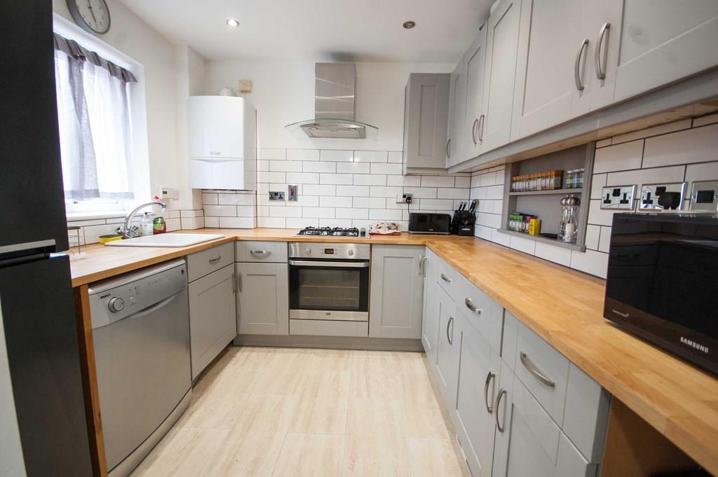 Double glazed window to front, modern range of wall and base units, oak worktops with butler sink inset, uilt in stainless steel oven, four ring gas hob with stainless steel extractor hood over, space for fridge freezer and dishwasher, Vaillant combi boiler to wall.