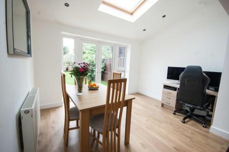 Pitched roof with velux window inset, double glazed french doors to rear overlooking the garden, wood effect flooring, radiator