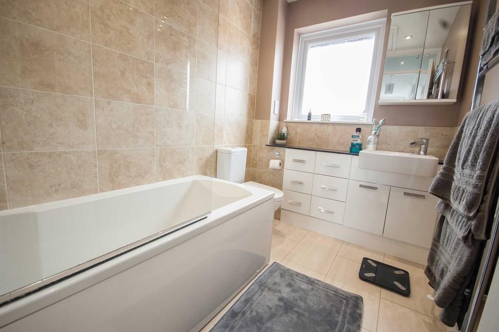 Obscure double glazed window to front, bath with shower over, low level W/C, vanity hand wash basin, chrome towel radiator, part tiled walls, tiled flooring.