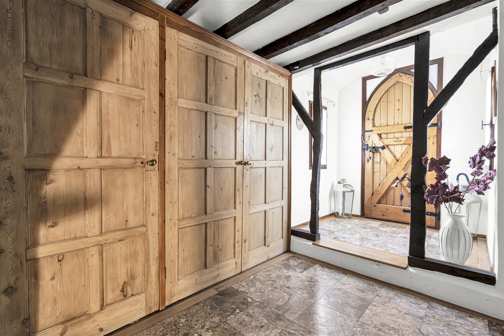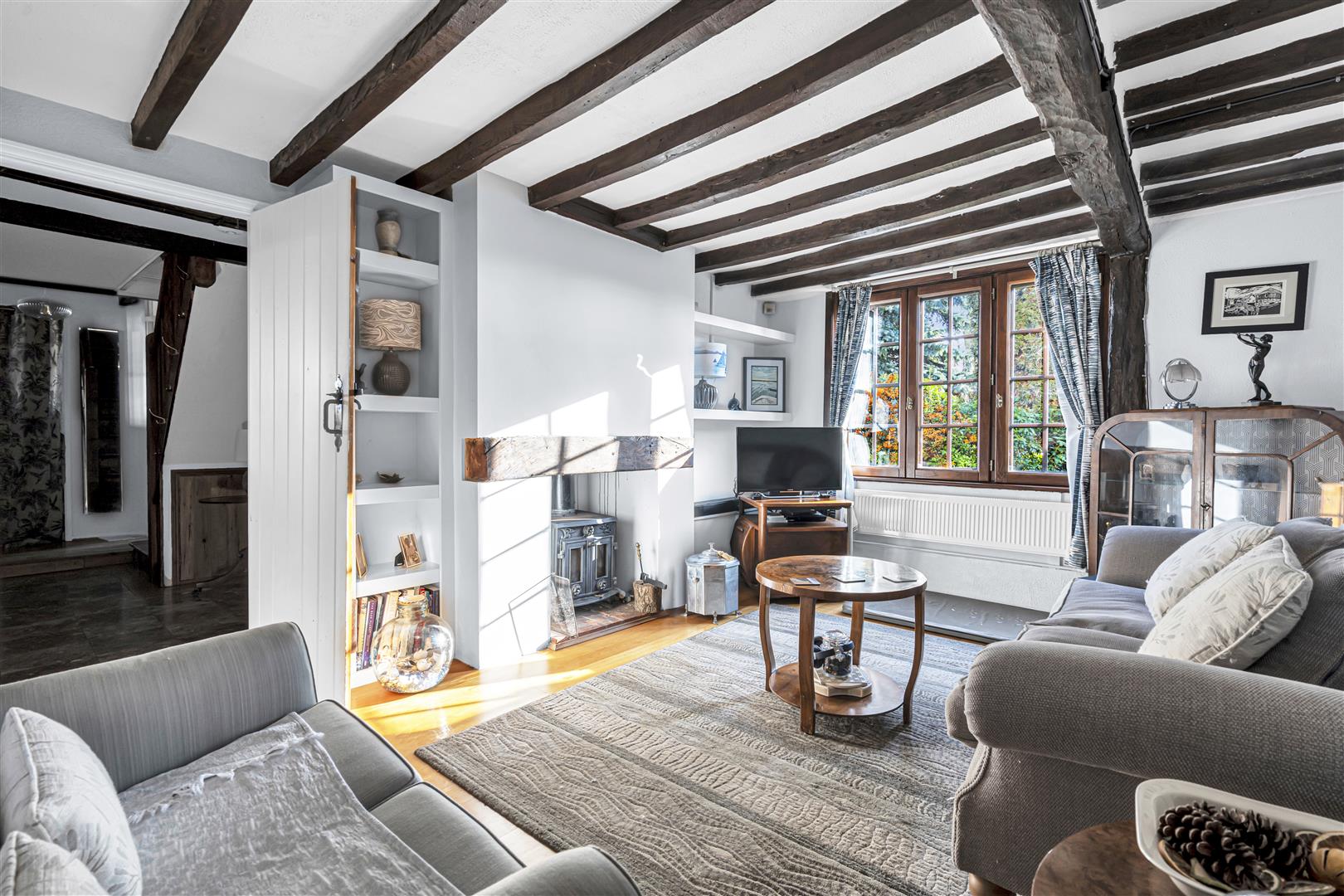 A solid timber entrance door opens into a welcoming hallway, where exposed timbers and bespoke fitted storage immediately set the tone. The principal sitting room is rich in period charm, featuring exposed beams, a central fireplace with a substantial timber lintel and a deep-set window overlooking the garden an inviting space for cosy evenings in. Open studwork leads through to a further tucked-away area with exposed brickwork and timber detailing, perfect as a snug, reading nook or quiet workspace away from the main living areas.